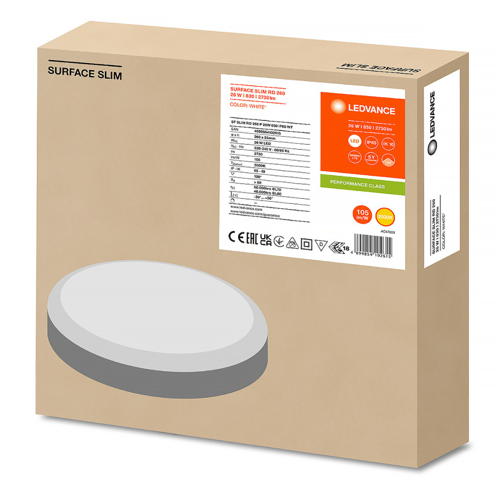 Ledvance professzionális Surface Slim IK10 RD 260 LED lámpa, 2730 lm, 3000 K, 26W, RA> 80, 120 °, IP65