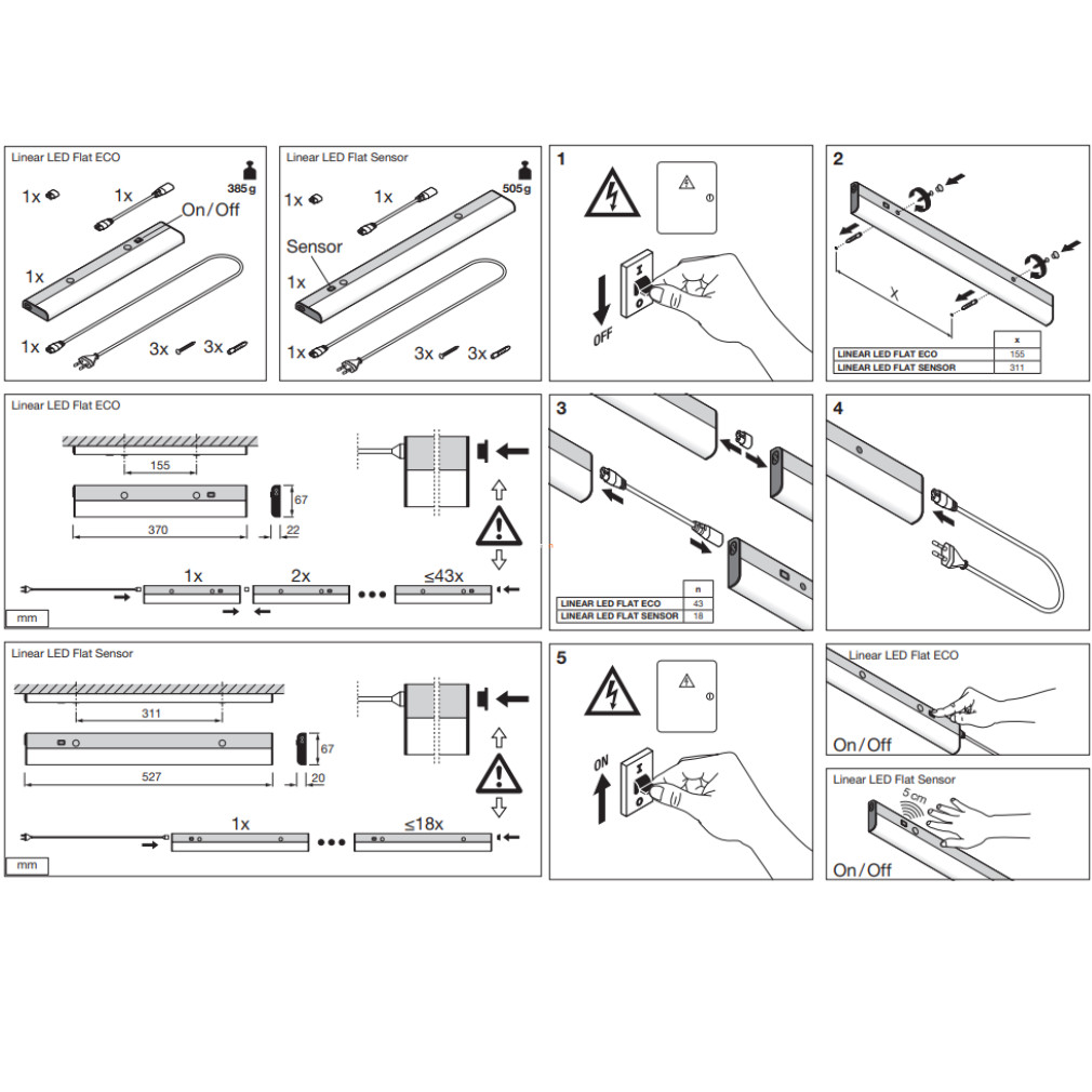 A Ledvance pultvilágító LED lámpa Linear LED Flat Eco modellje 37 cm hosszúságú, 6 W teljesítményű, beépített LED modullal rendelkezik, amely 300 lumen fényáramot biztosít melegfehér, 3000 K színhőmérsékleten. A lámpatest IP20 védettséggel készül, ezáltal beltéri használatra alkalmas. Az alumínium és műanyag kombinációjából készült ház ezüst színű felülettel rendelkezik, kialakítása kompakt, méretei 370 mm hosszú, 67 mm széles és 22 mm magas. A termék nem szabályozható, a fényforrás a lámpatestbe integrált LED modul. A lámpa súlya 0,34 kg. A Linear LED Flat Eco egyszerűen felszerelhető, és energiahatékony megoldást kínál pultok, bútorok vagy egyéb beltéri felületek megvilágítására.