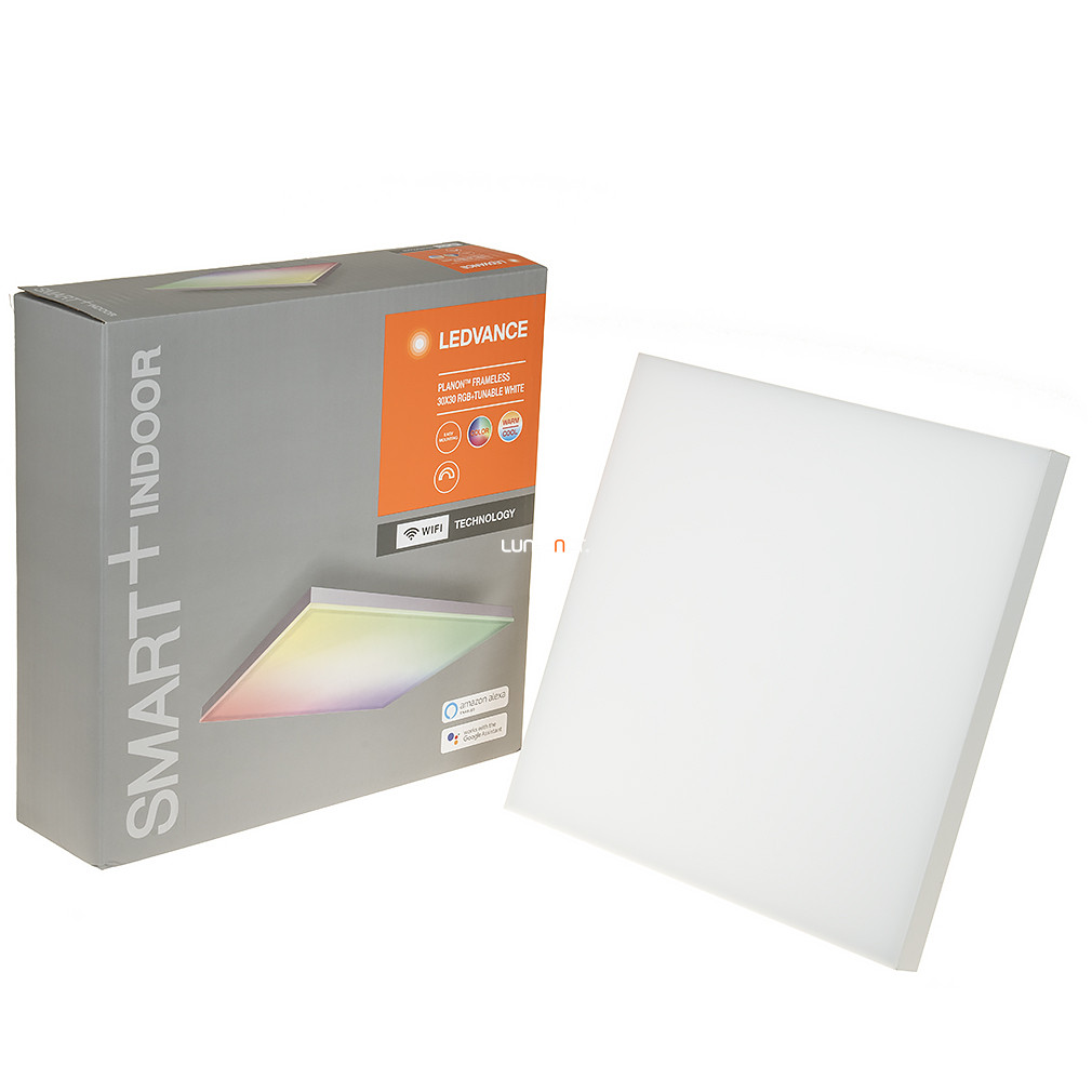 A Ledvance Smart+ WIFI okos LED panel egy modern, 30x30 cm méretű, keret nélküli világítótest, amely 20 W teljesítményű LED modullal működik. A panel fényárama 1500 lumen, színhőmérséklete 3000 és 6500 Kelvin között szabályozható, továbbá RGB színtartományba is állítható, így változtatható fehér és színes fényeket egyaránt biztosít. A lámpatest alumíniumból és műanyagból készült, fehér színű kivitelben, IP20 védettséggel rendelkezik. A világítás vezérlése Wi-Fi kapcsolaton keresztül, mobilalkalmazással történik, de távirányítóval is irányítható. A LED panel átlagos élettartama 25 000 óra, fényforrása integrált LED modul. A termék tömege 1,56 kg, magassága 69 mm, szélessége és hosszúsága egyaránt 300 mm.