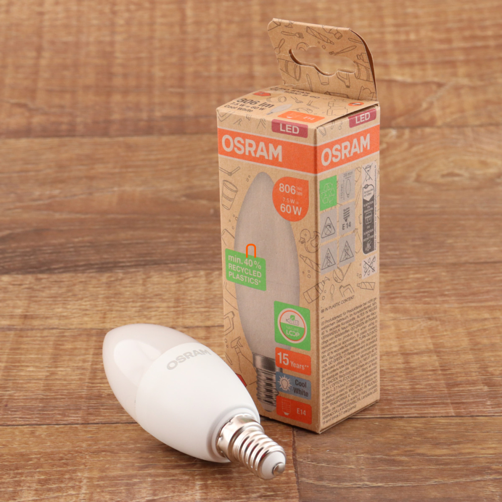 Osram újrahasznosított E14 LED, 7,5 W, 806 lm, hidegfehér fényű (Classic-B)