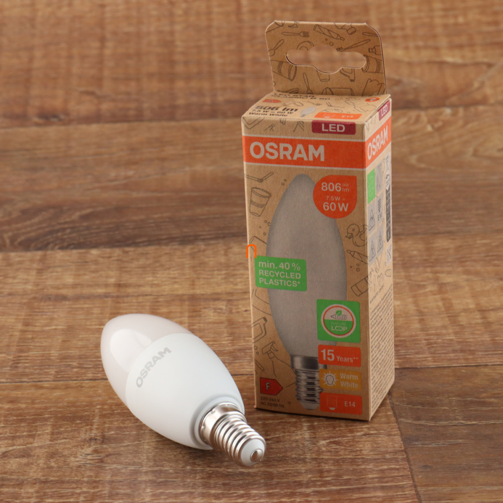Osram újrahasznosított E14 LED, 7,5 W, 806 lm, melegfehér fényű (Classic-B)