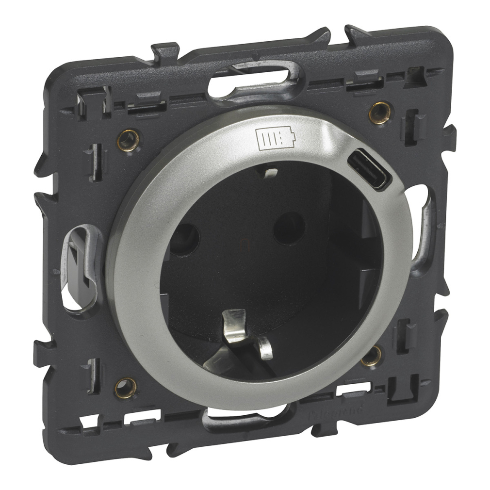Legrand 068419 Céliane 2P+F csatlakozóaljzat + USB-C töltőaljzat 1,5A-5V-7,5W, körmös/csavaros rögzítés, rugós bekötéssel, titán