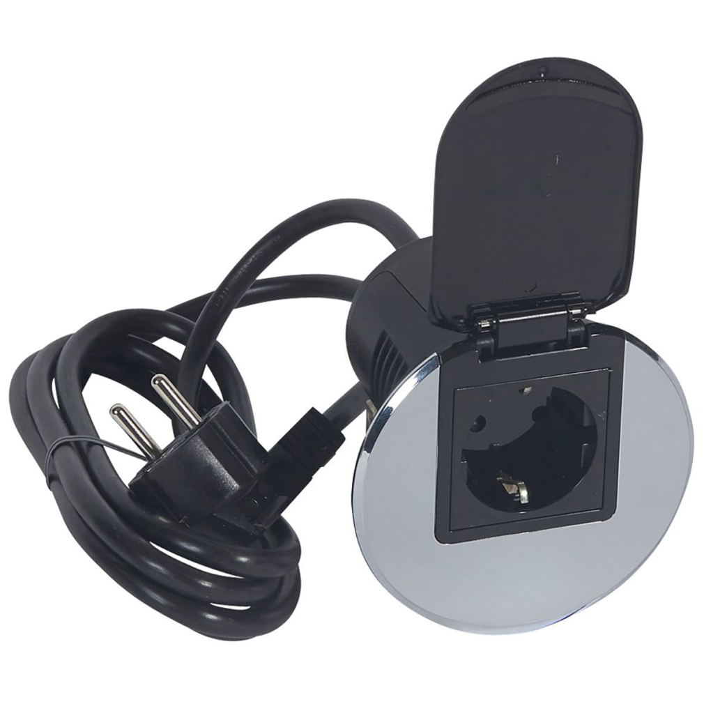 Leg. 054082 Összeszerelt asztali kábelrendező 2P+F csatlakozóaljzattal, rozsdamentes acélkeret és fekete mechanizmus, 1x2P+F csatlakozóaljzat fedéllel, 2 m tápkábel 2P+F dugóval