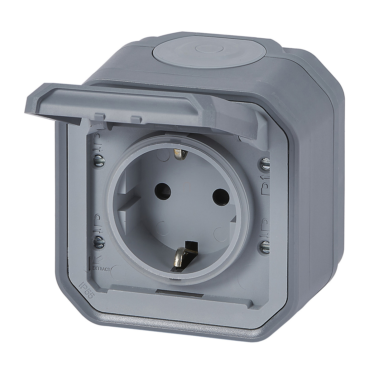 Plexo 55 falon kívüli 2P+F csatlakozóaljzat csapófedéllel, összeszerelt, csavaros vezetékbekötéssel, szürke 069733L Legrand