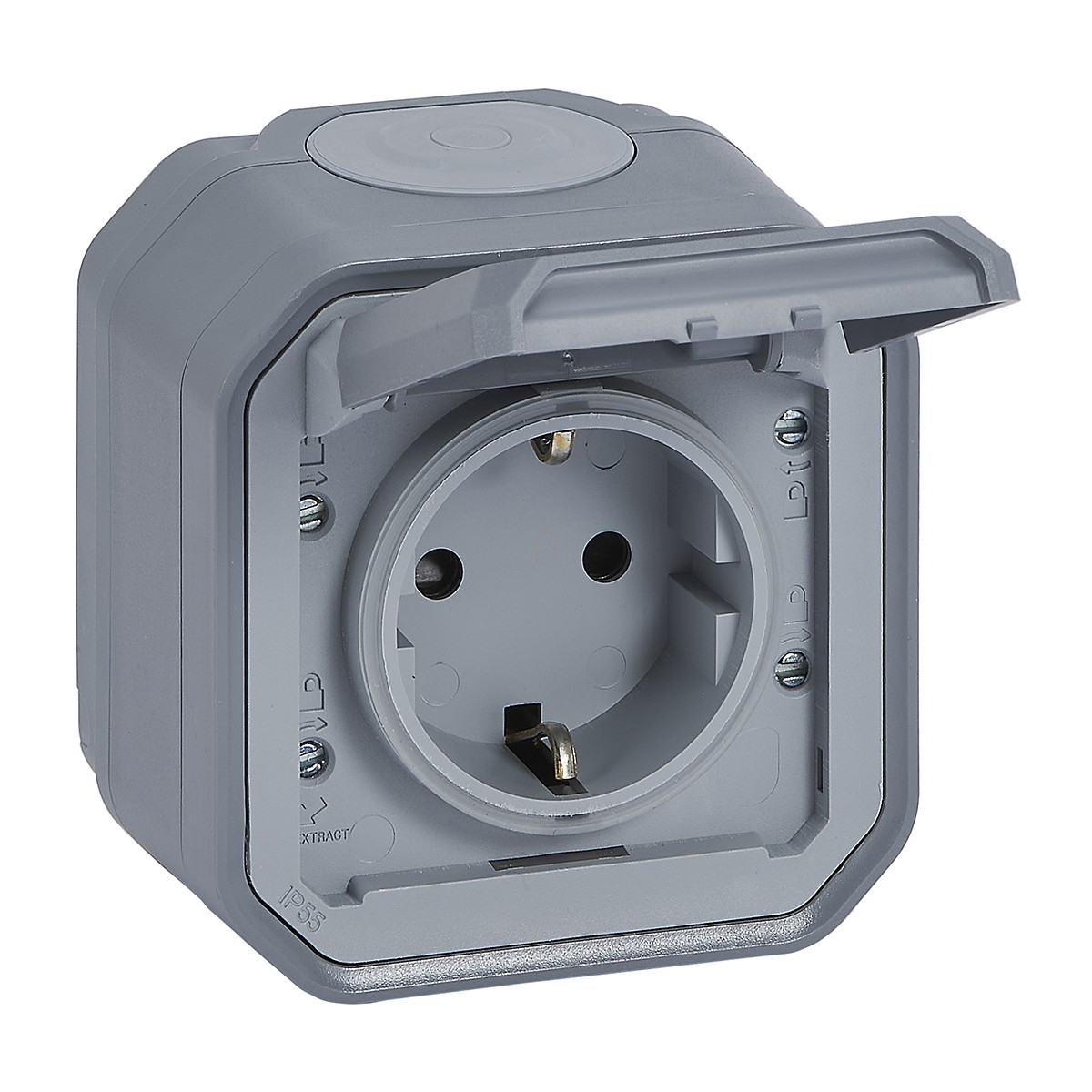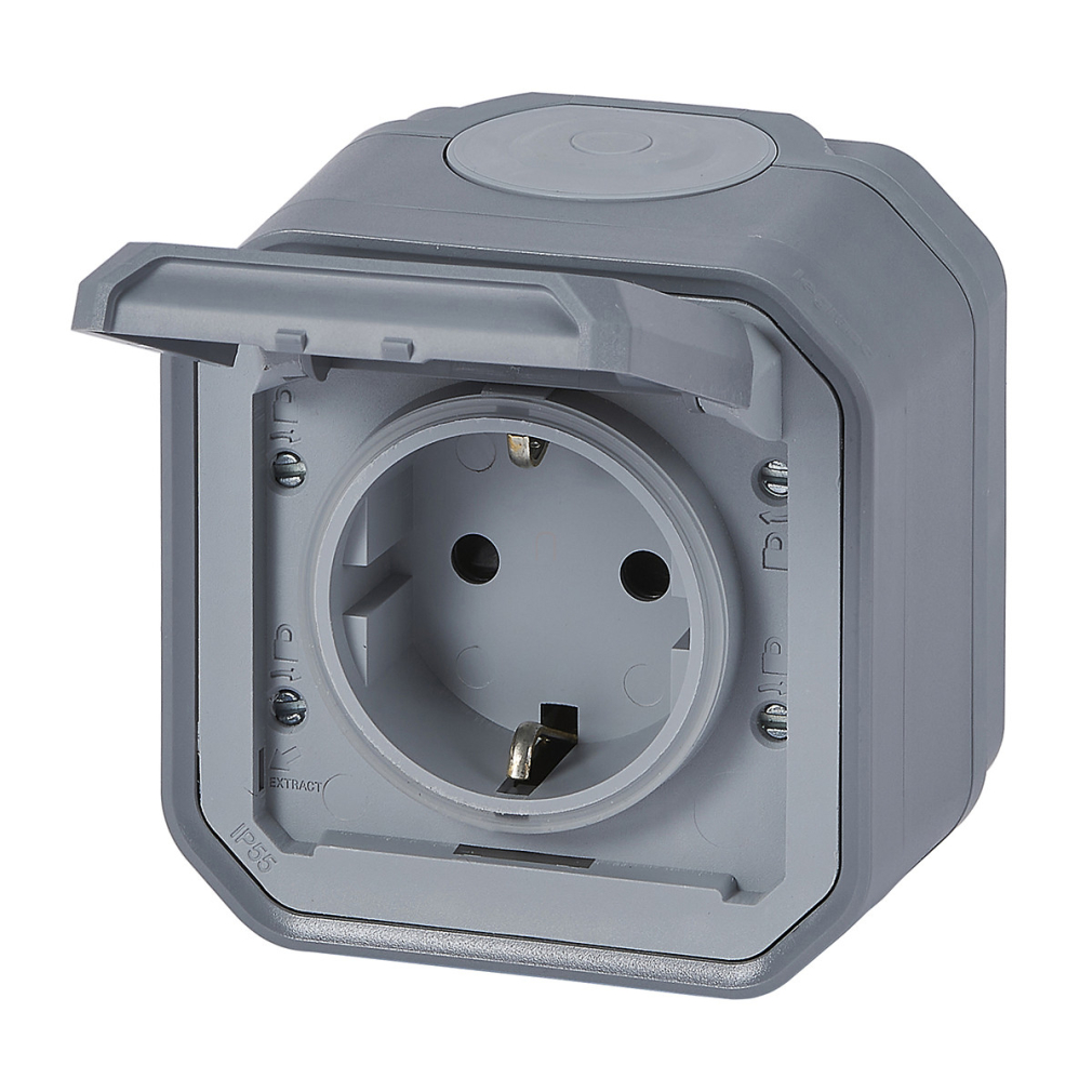 Legrand Plexo 55 falon kívüli 2P+F csatlakozóaljzat csapófedéllel, összeszerelt, csavaros vezetékbekötéssel, szürke - 069733L