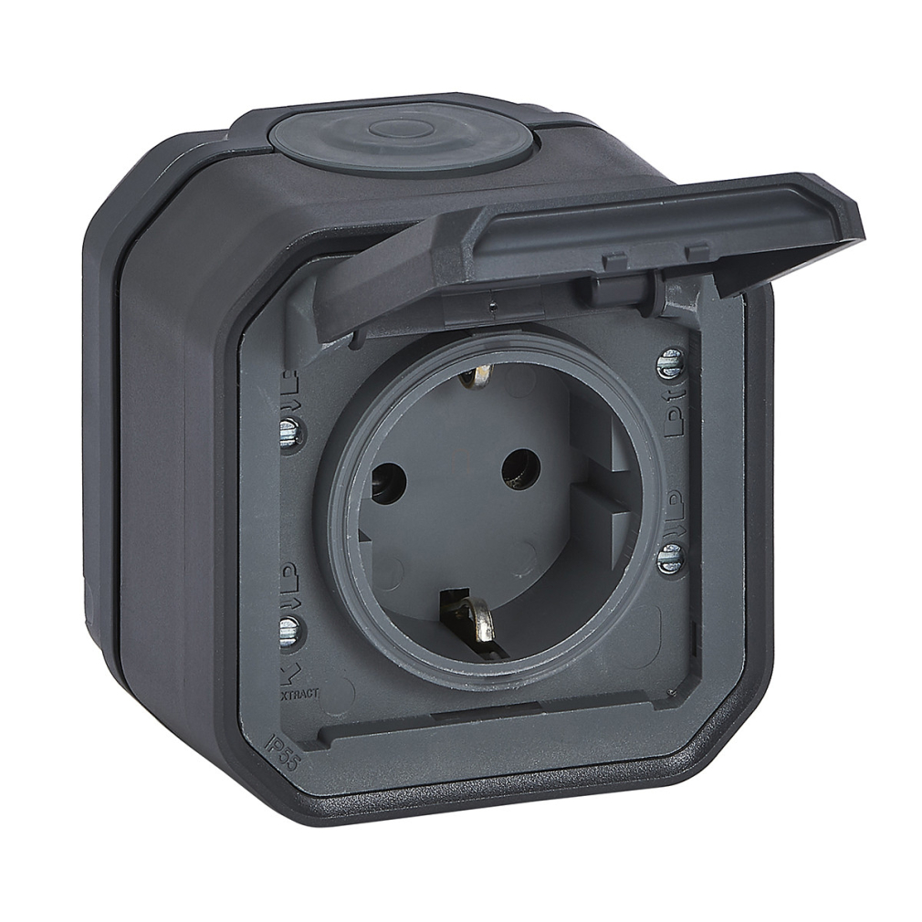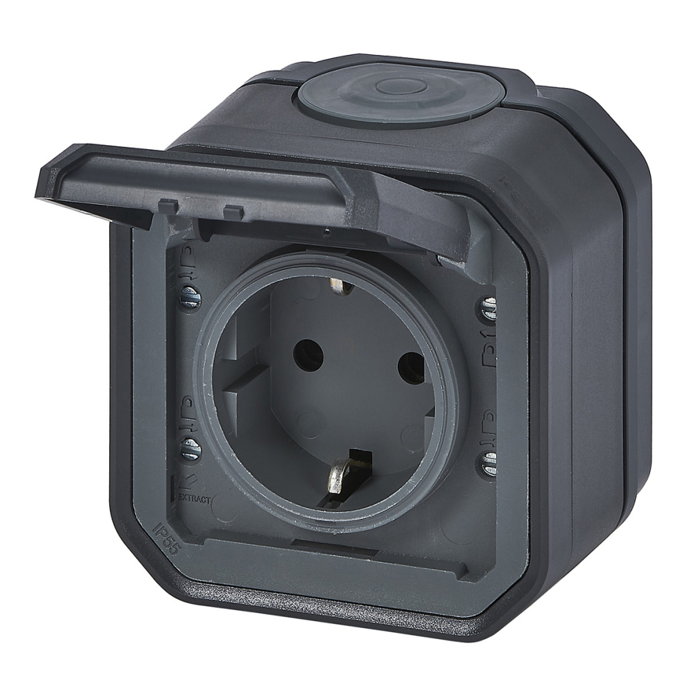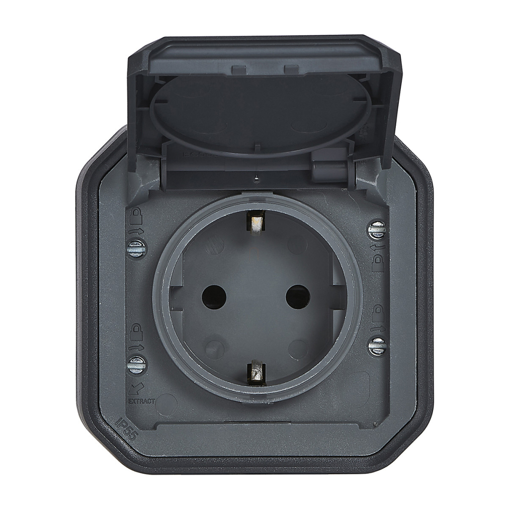 Legrand Plexo 55 falon kívüli 2P+F csatlakozóaljzat csapófedéllel, összeszerelt, rugós vezetékbekötéssel, antracit - 069799L