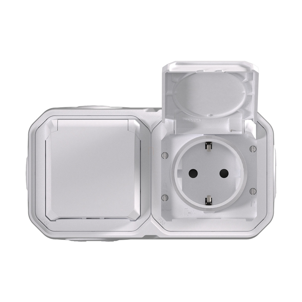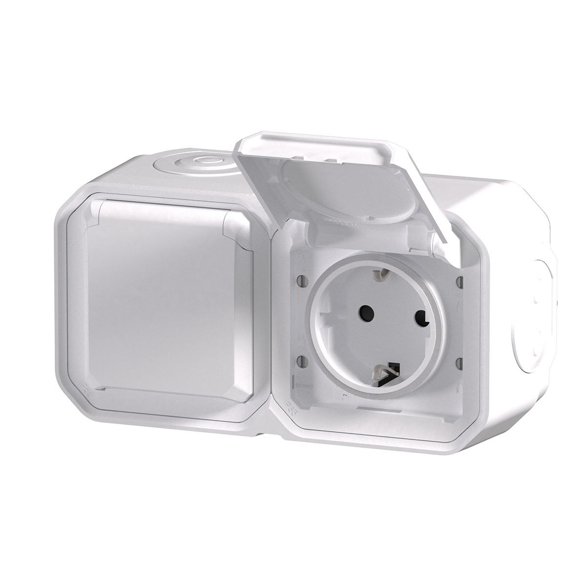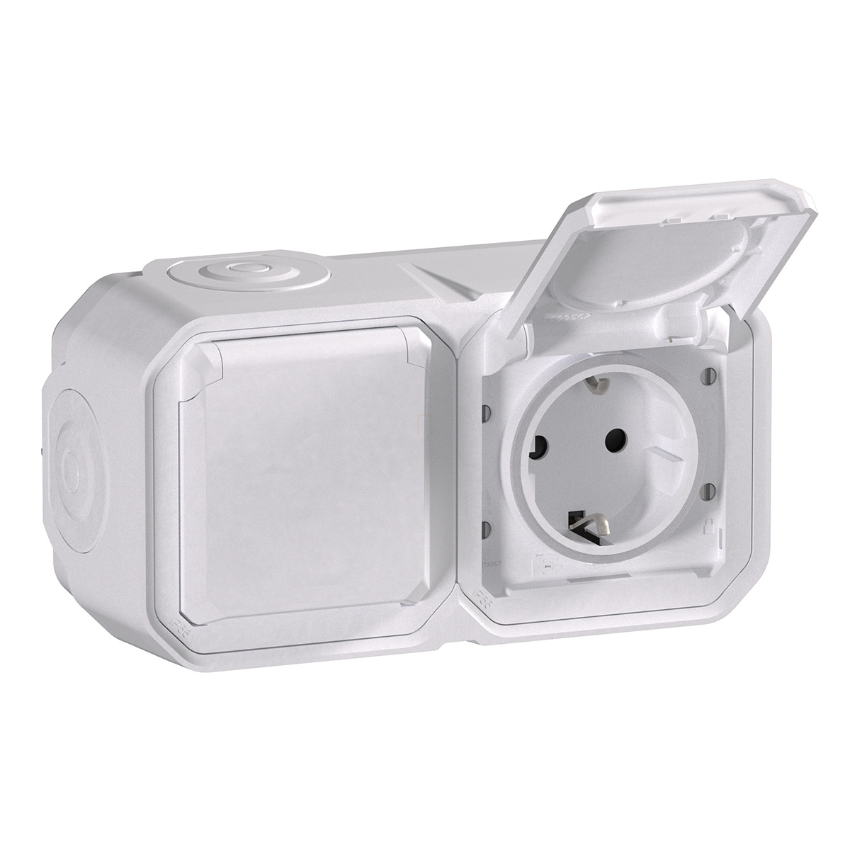 Plexo 55 falon kívüli 2x2P+F elővezetékezett vízszintes csatlakozóaljzat csapófedéllel, összeszerelt, fehér 069772L Legrand