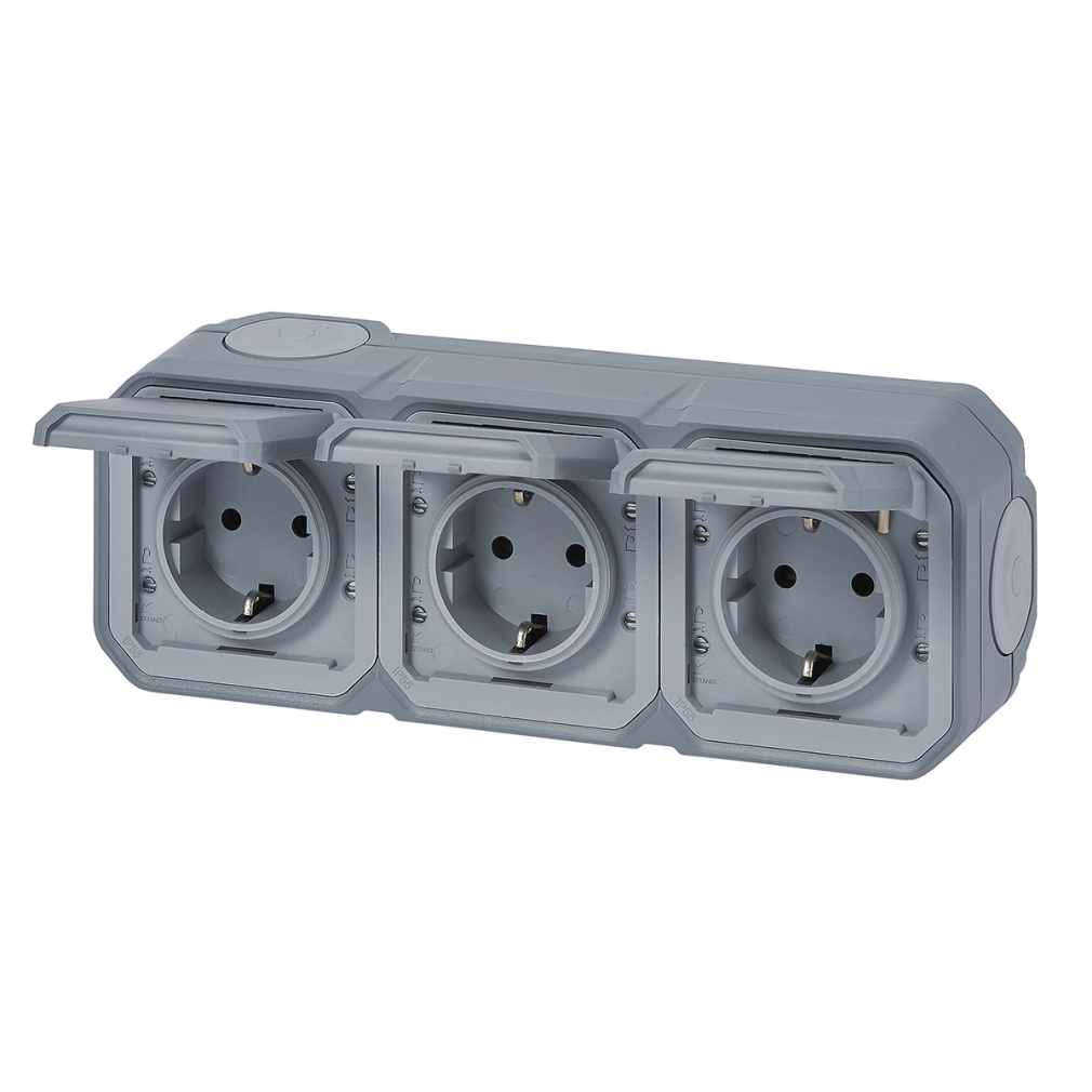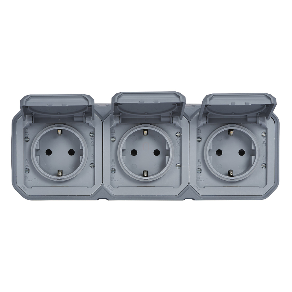 Plexo 55 falon kívüli 3x2P+F elővezetékezett vízszintes csatlakozóaljzat csapófedéllel, összeszerelt, szürke 069743L Legrand