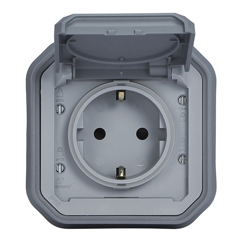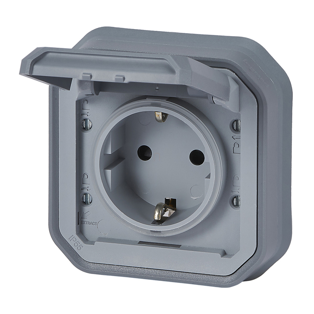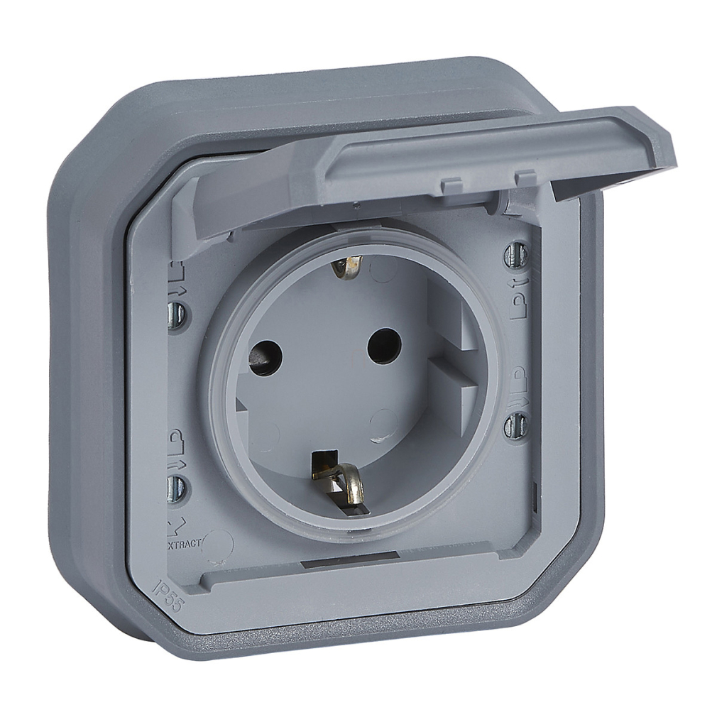 Plexo 55 süllyesztett 2P+F csatlakozóaljzat csapófedéllel, összeszerelt, rögzítőkörommel és csavaros vezetékbekötéssel, szürke 069834L Legrand
