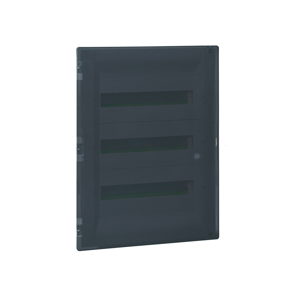 Legrand Practibox3 süllyesztett kiselosztó, átlátszó füstszínű ajtóval, védőföld és nulla elosztókapoccsal, 3 sor 54 modul, 592x422 - 401758