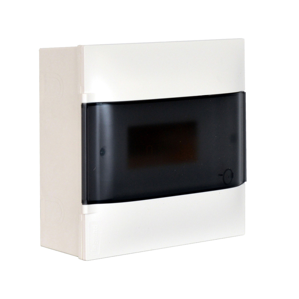 Legrand 134218 PractiboxS falon kívüli kiselosztó, 1 sor 8 modul, átlátszó füstszínű ajtóval, védőföld és nulla elosztókapoccsal