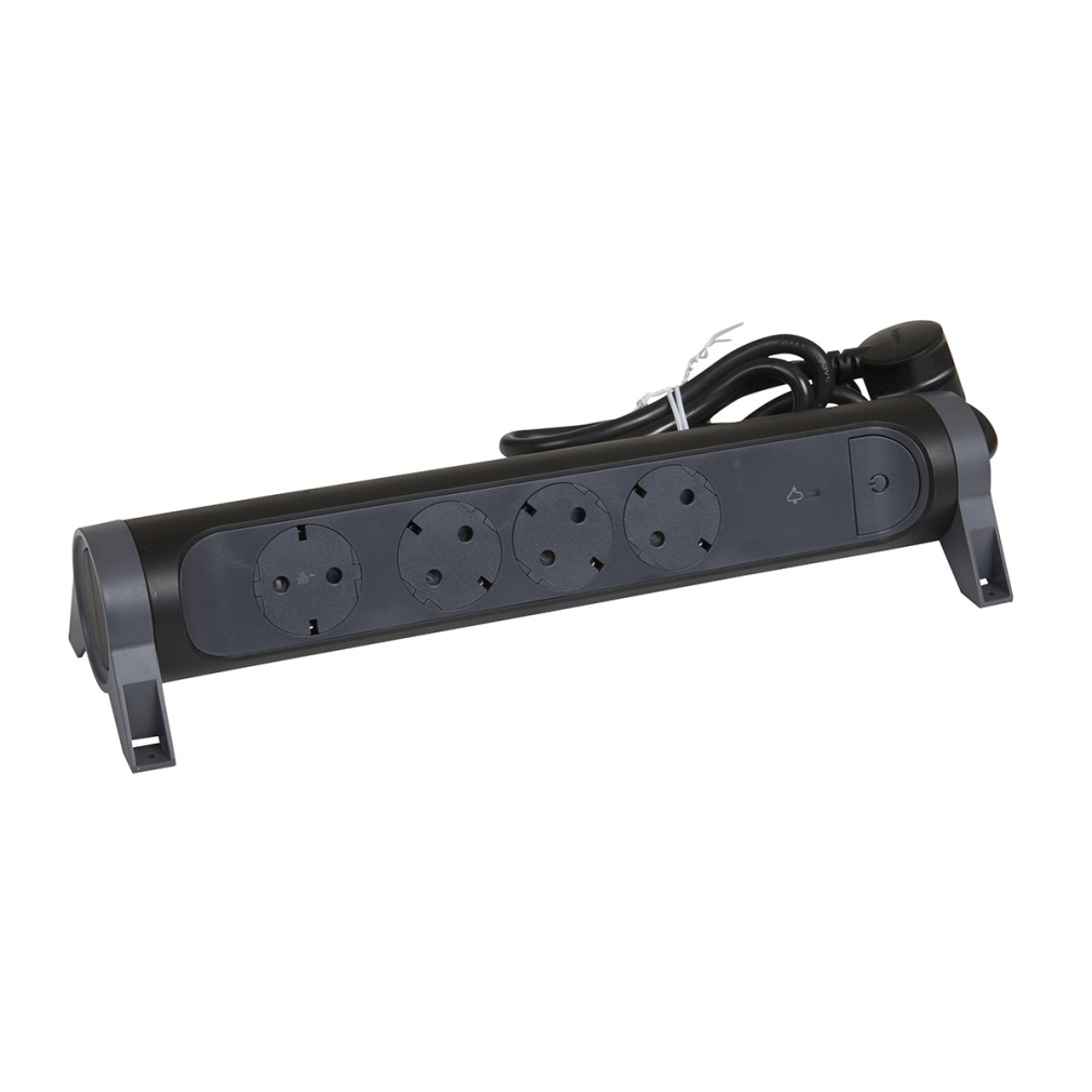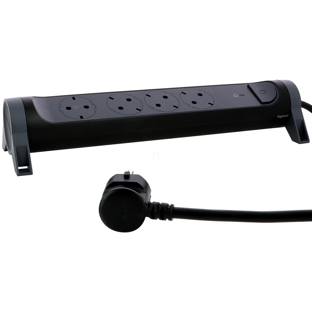 Hálózati elosztó 4db aljzat 1,5fm vezetékkel, túlfeszültség levezetővel, kapcsolóval, falra szerelhető, forgatható, fekete Premium 694511 Legrand
