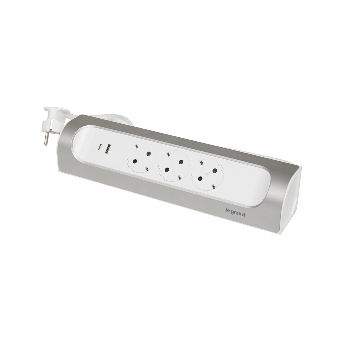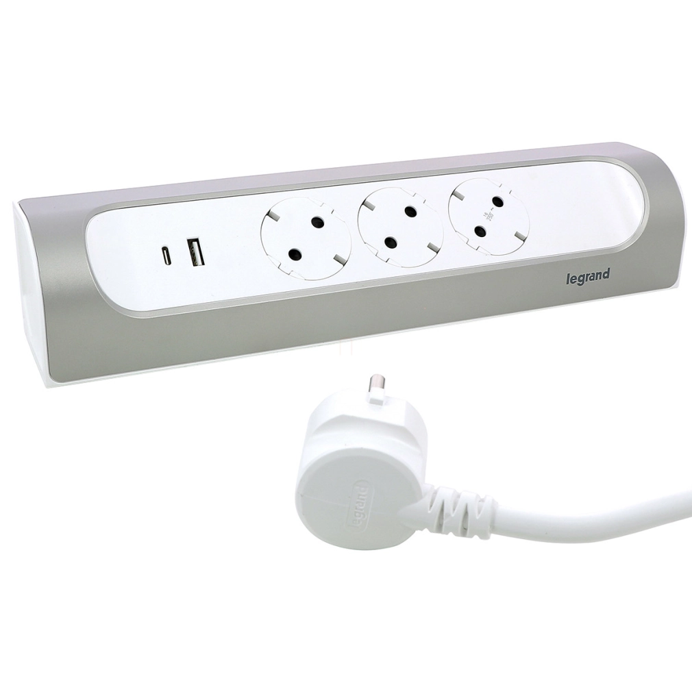 Legrand sarokba illeszkedő elosztósor, 3x2P+F, USB-A + USB-C, 1 m vezetékkel, fehér-alumínium - 694502