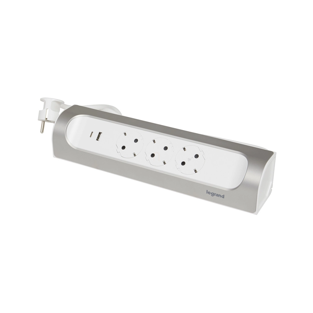 Hálózati elosztó 3db aljzat 1fm vezetékkel, sarokba illeszkedő, USB-A + USB-C fehér-alumínium 694502 Legrand