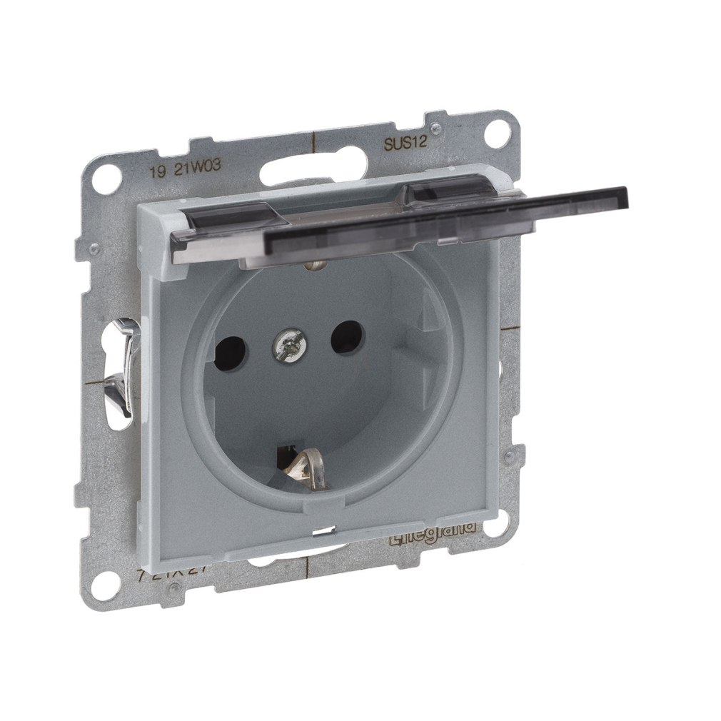 Legrand Suno 2P+F csatlakozóaljzat (rugós), biztonsági zsaluval, csapófedéllel IP21, alumínium - 721327
