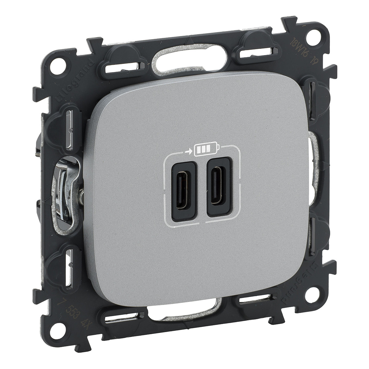 Valena Allure alumínium Töltőaljzat Kettős USB C-típusú csatlakozóval, 5V–3A–15W, Túlfesz-védelem >1kW, Class II SELV, 755347 Legrand