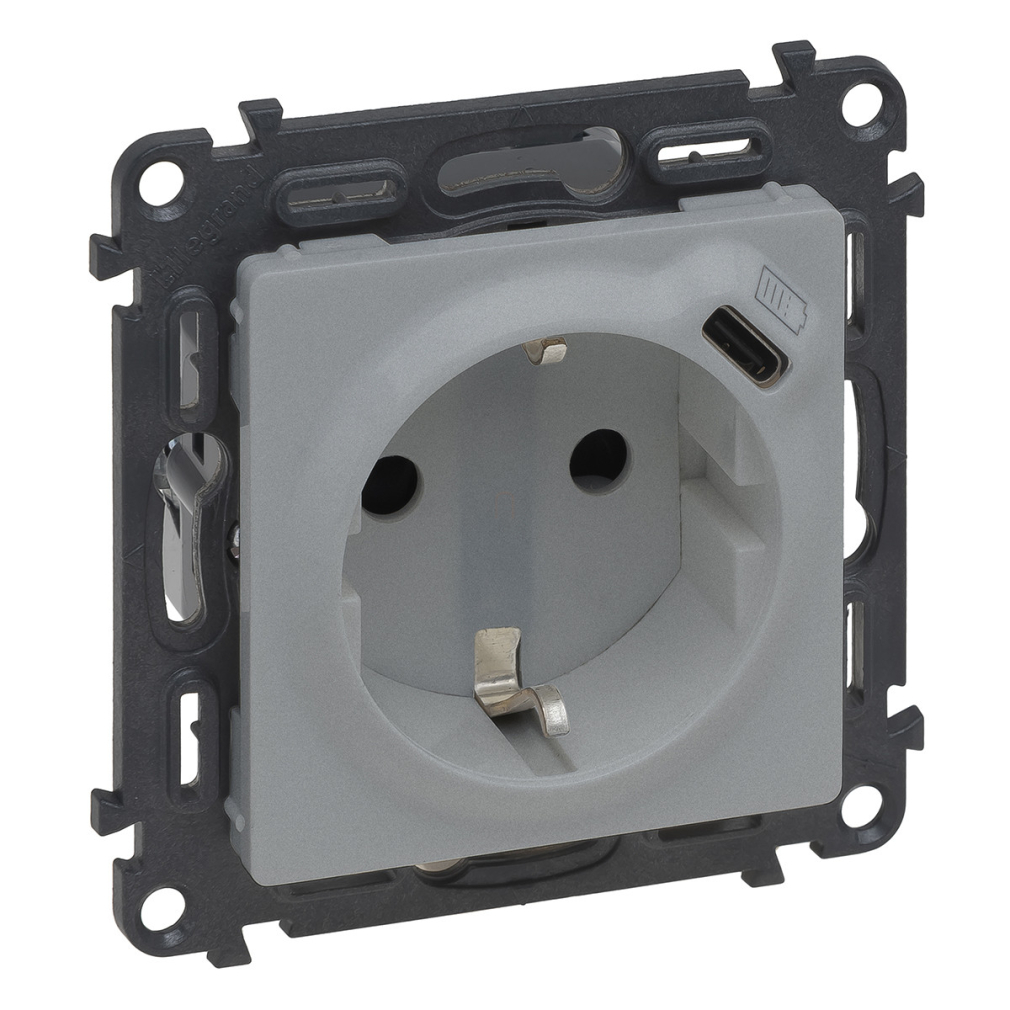 Legrand Valena Life 2P+F csatlakozóaljzat + USB-C töltőaljzat 1, 5A-5V-7, 5W, körmös/csavaros rögzítés, rugós bekötéssel, alumínium - 753335