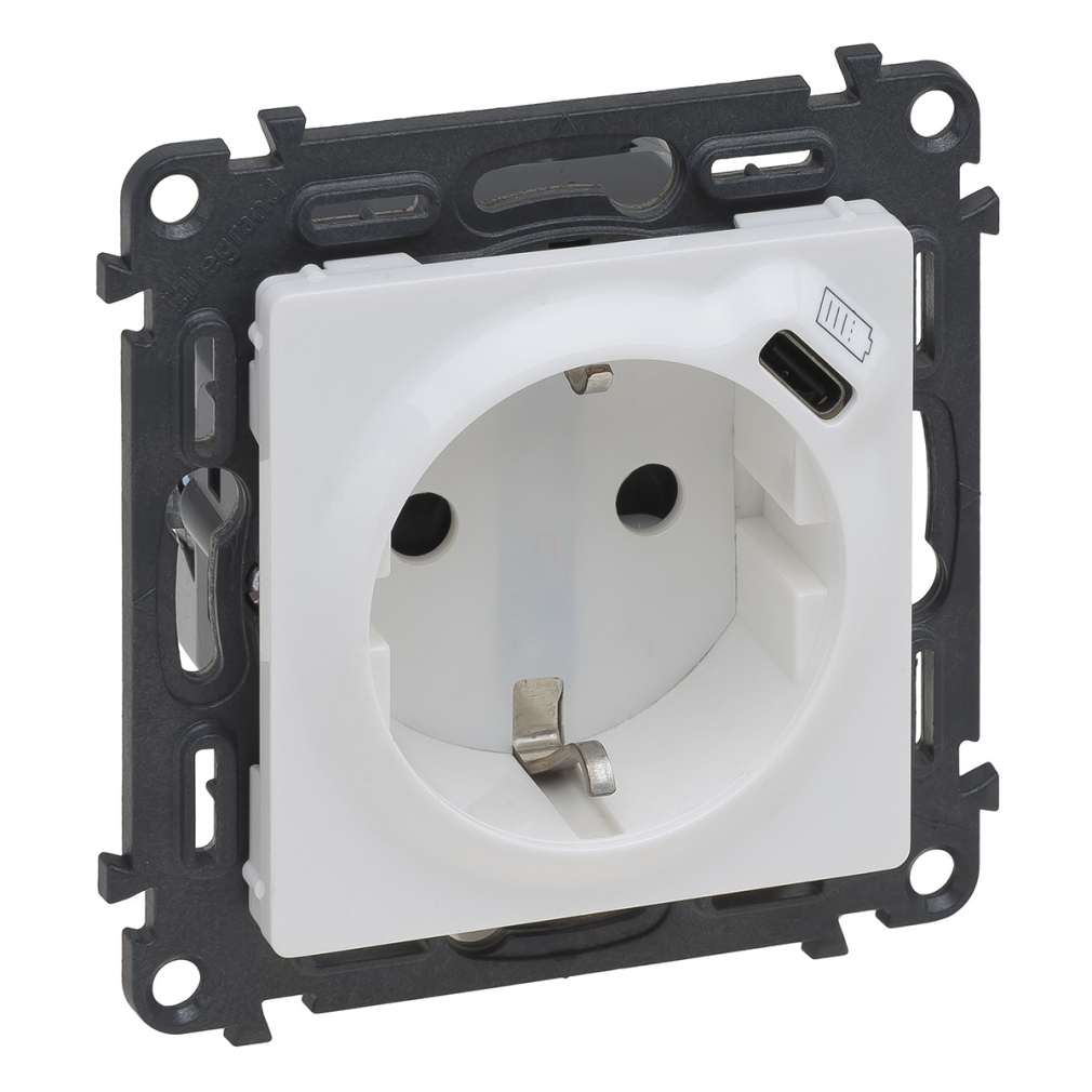 Legrand Valena Life 2P+F csatlakozóaljzat + USB-C töltőaljzat 1, 5A-5V-7, 5W, körmös/csavaros rögzítés, rugós bekötéssel, fehér - 753135