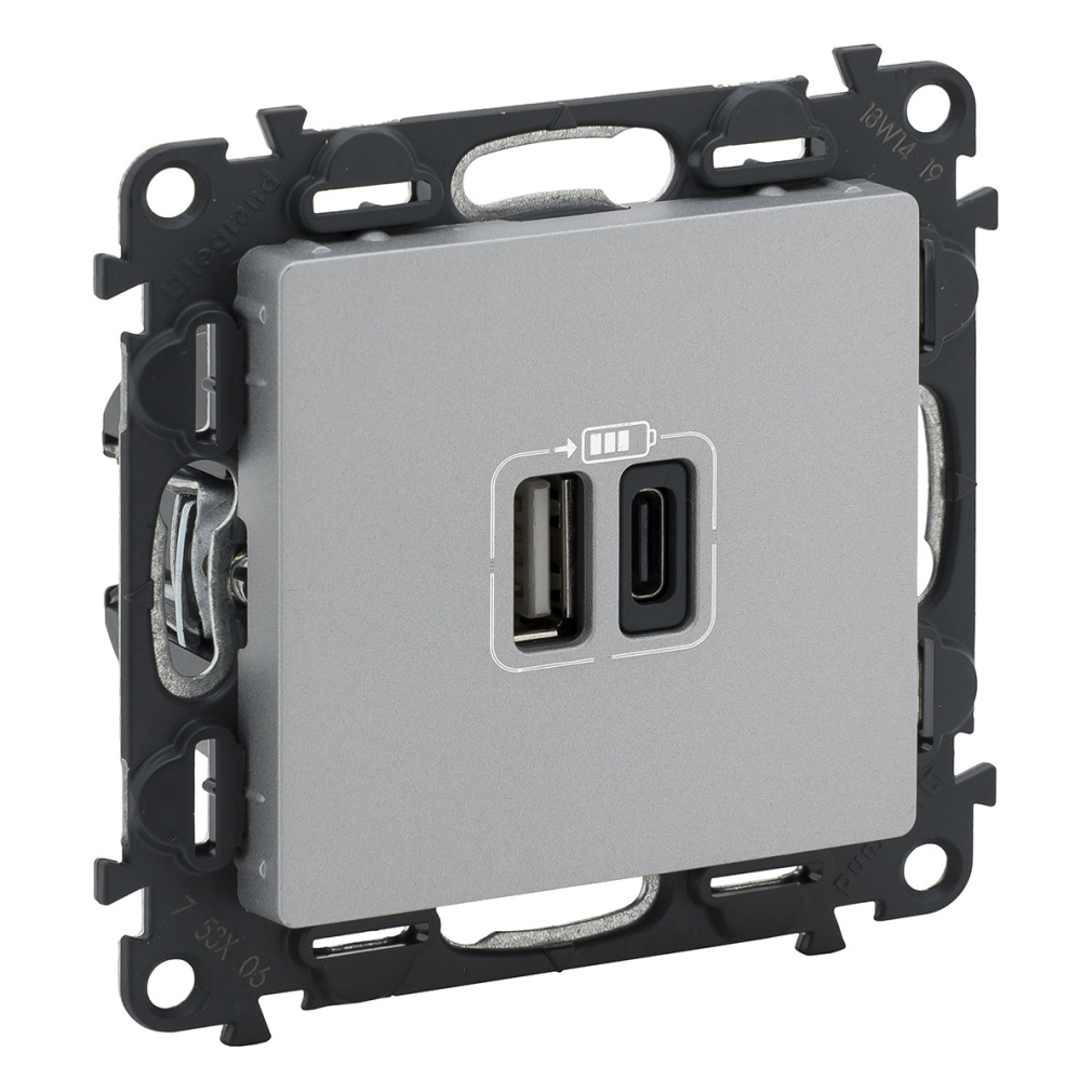 Legrand Valena Life töltőaljzat kettős USB C-típusú + USB A-típusú csatlakozóval, 5V–3A–15W, Túlfesz-védelem <gt/>1kW, Class II SELV, alumínium - 753306