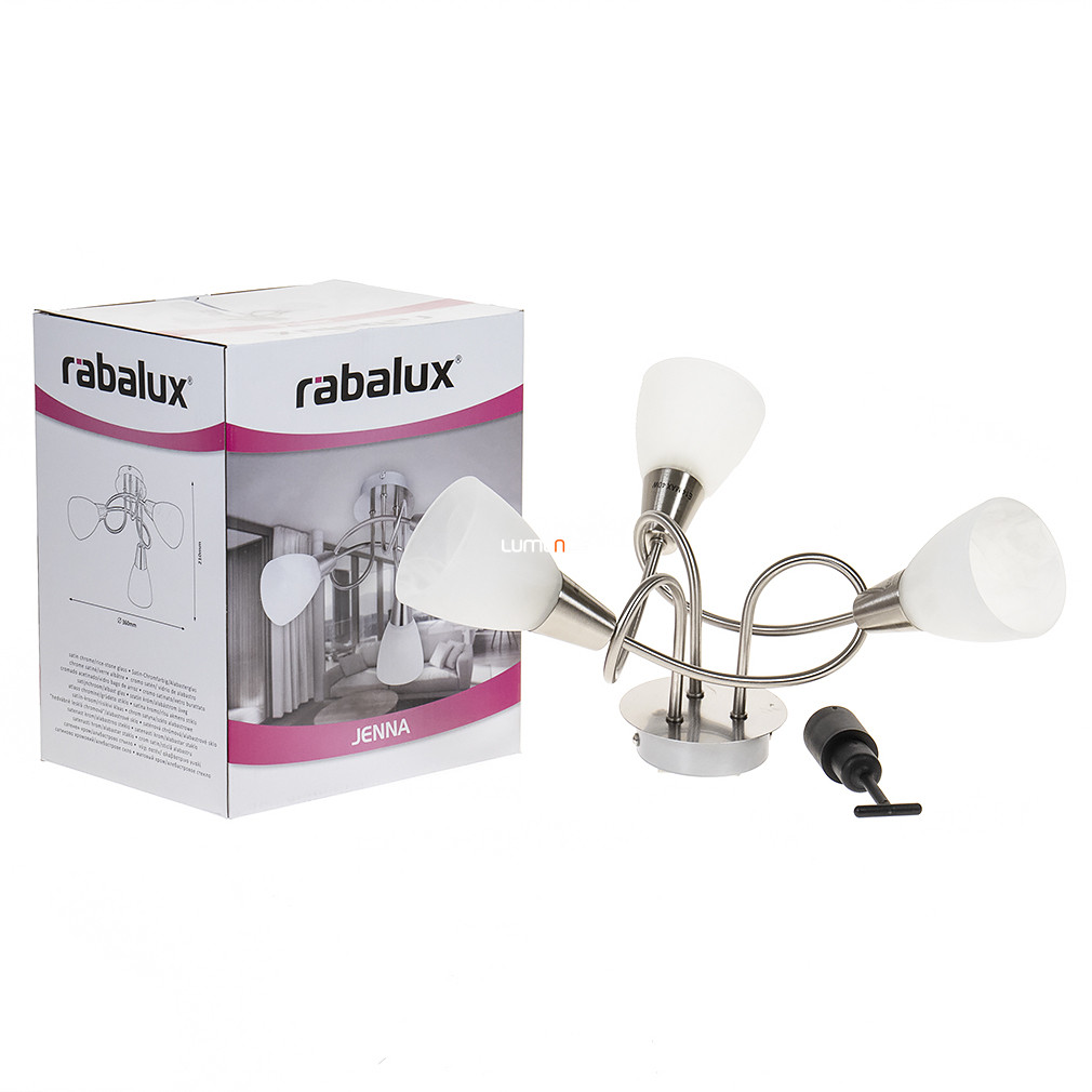 A Jenna Rábalux 5532 mennyezeti lámpa három darab E14 foglalattal rendelkezik, lehetővé téve különböző cserélhető fényforrások használatát. A lámpatest modern stílusban készült, fő anyaga fém és üveg, színe ezüst és opál kombinációja. A lámpa átmérője 360 mm, magassága 210 mm, tömege 1,15 kg. Az IP20 védettségi szint beltéri használatra teszi alkalmassá, a fényforrásokat nem tartalmazza. Szabályozható funkcióval nem rendelkezik, a színhőmérséklet, fényáram és teljesítmény a behelyezett fényforrásoktól függően változtatható. A termék gyártója a Rábalux, logisztikai kódja 5532.