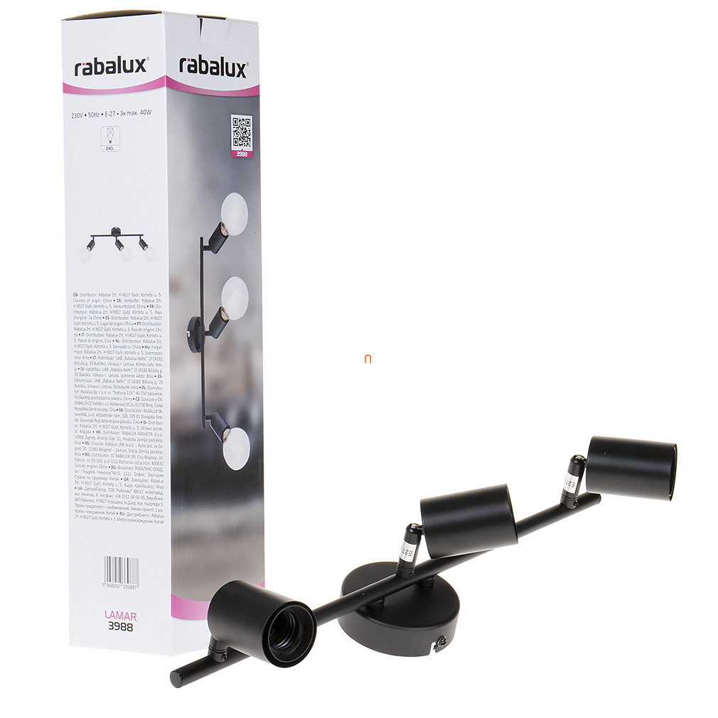 A Lamar Rábalux 3988 mennyezeti lámpa három E27 foglalattal rendelkezik, melyek cserélhető fényforrásokkal használhatók. A lámpatest anyaga fém, felülete fekete színű, modern megjelenést biztosítva a belső terek számára. A termék méretei: 140 mm hosszúság, 490 mm szélesség és 125 mm magasság. A lámpa nem tartalmaz fényforrást, így a felhasználó szabadon választhatja meg a kívánt teljesítményű és színhőmérsékletű izzókat. A termék IP20 védettségi besorolással rendelkezik, elsősorban beltéri használatra alkalmas. A lámpa nem szabályozható, így a fényerő kizárólag a behelyezett fényforrások tulajdonságaitól függ. A csomagolás méretei: 10 cm szélesség, 11 cm hosszúság és 46 cm magasság, a termék tömege 0,6 kg. A Lamar Rábalux 3988 a Rábalux gyártásában készült, logisztikai kódja 3988.