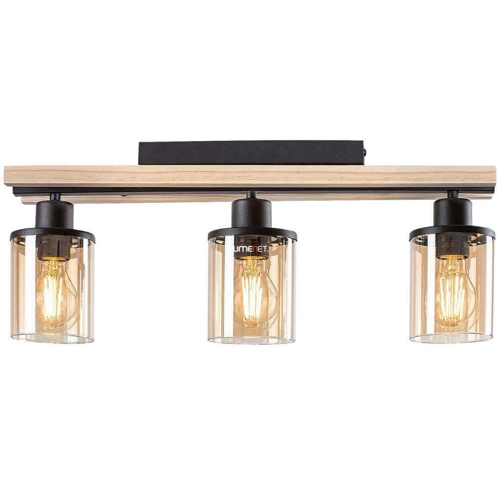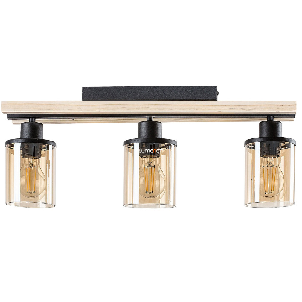 Ez a mennyezeti lámpa három foglalattal és elegáns anyagokkal, mint a fém, fa és üveg, tökéletes választás bármely modern otthonba.