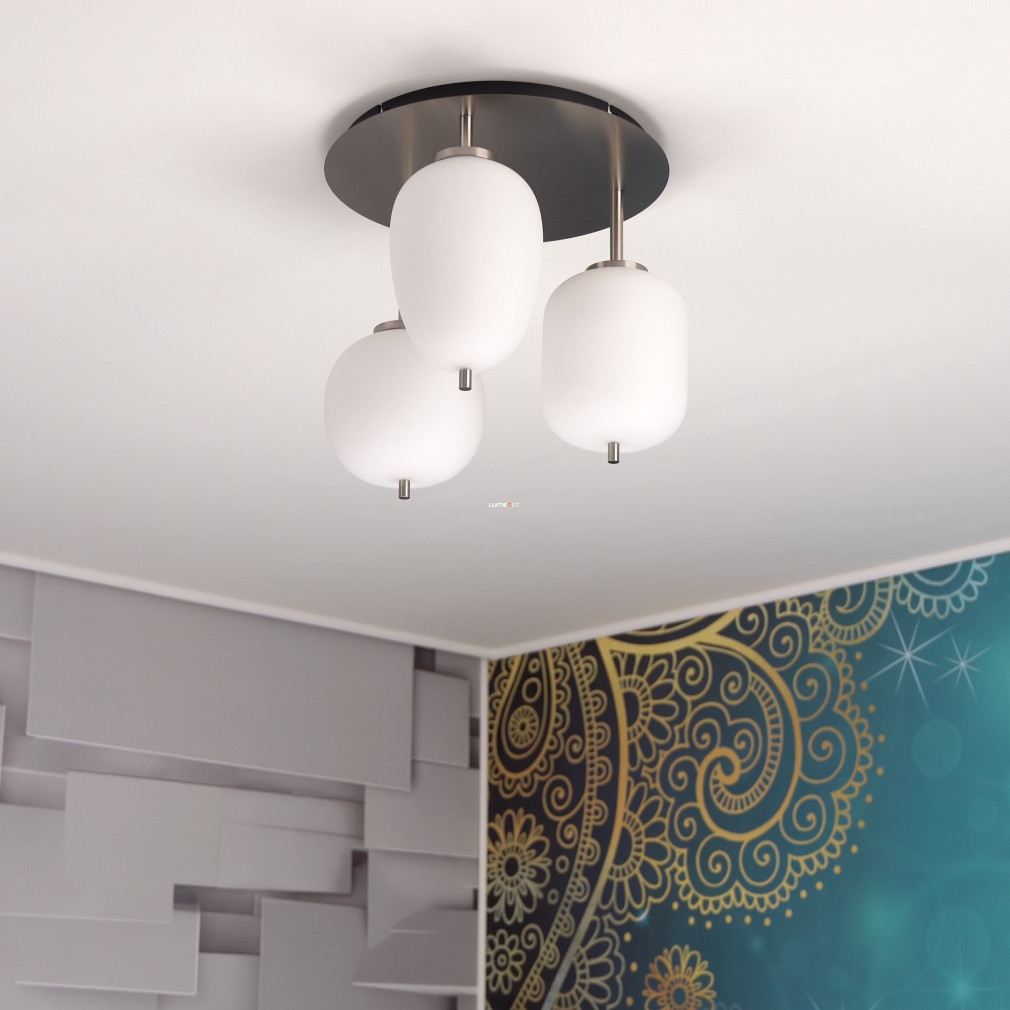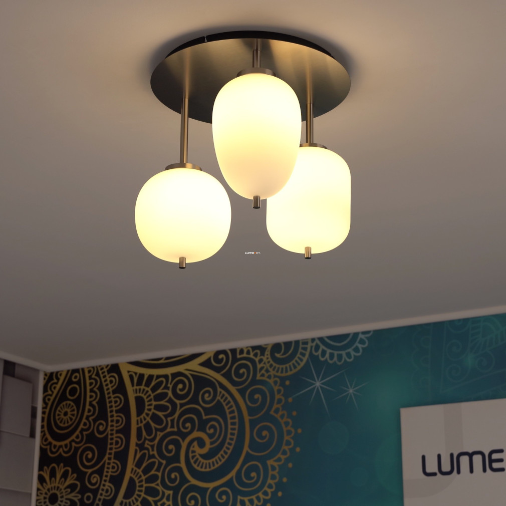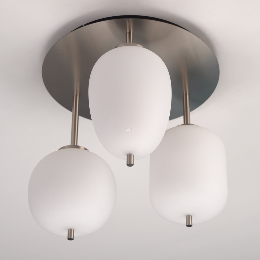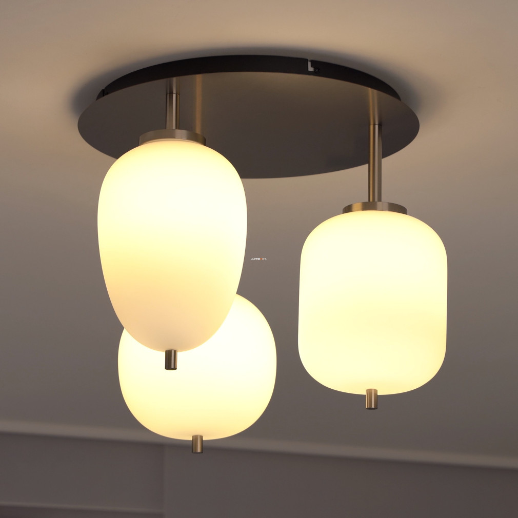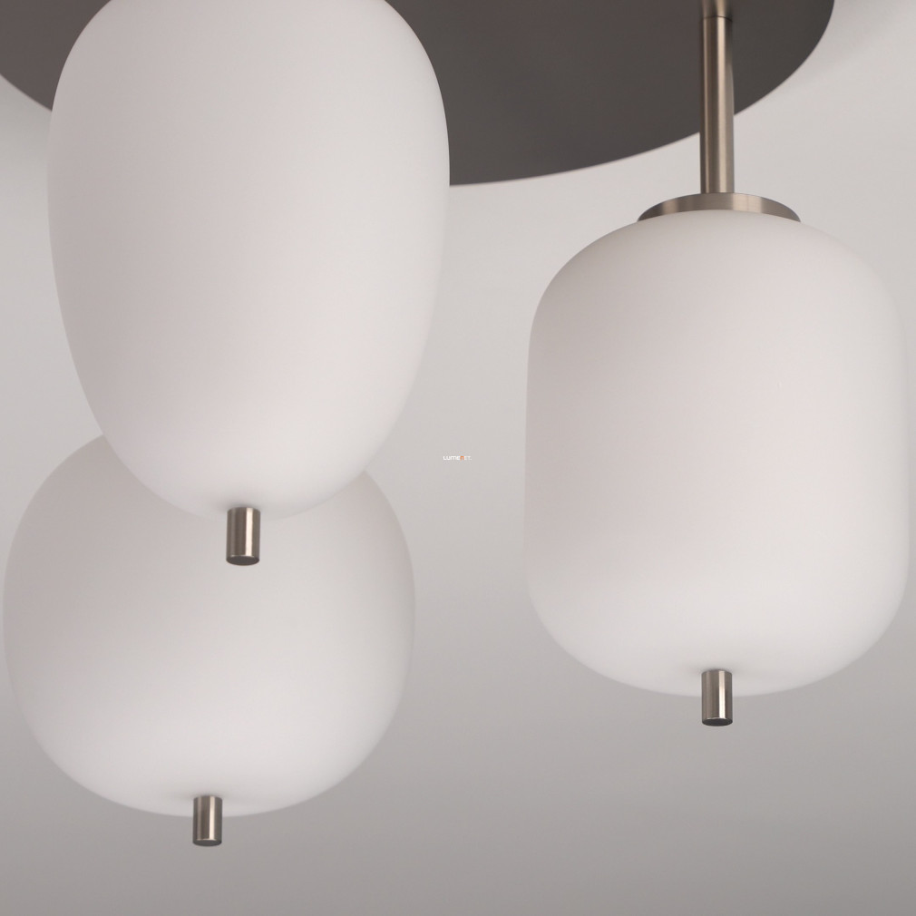 Ez a mennyezeti lámpa három különböző üveg búrával és elegáns nikkel, opál színkombinációval varázsolja el otthonodat.