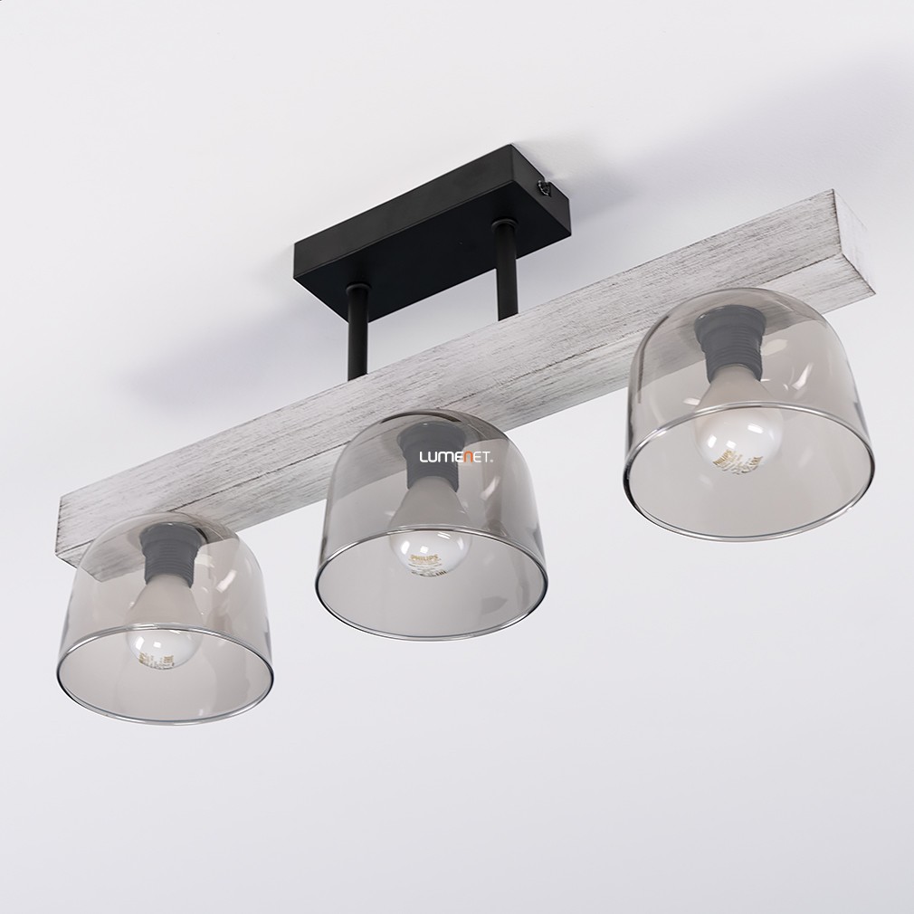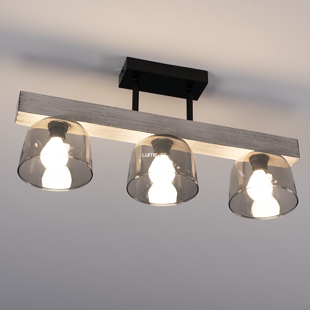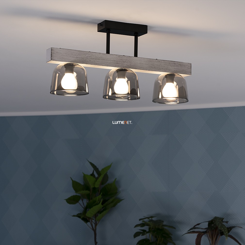 Ez a mennyezeti lámpa füstszínű üveg búrákkal és vintage stílussal varázsolja el otthonodat, miközben a fém, fa és üveg anyagok kombinációja eleganciát és melegséget sugároz.