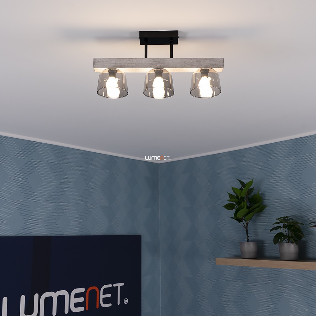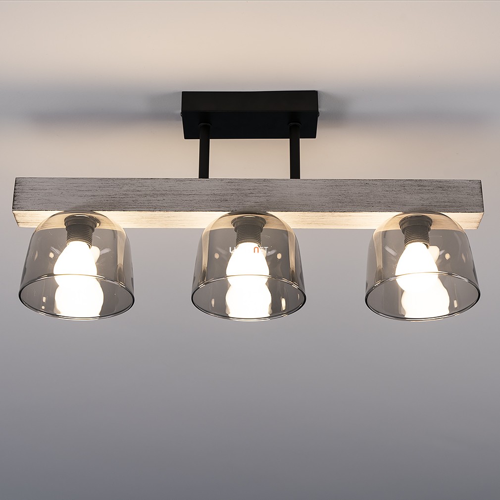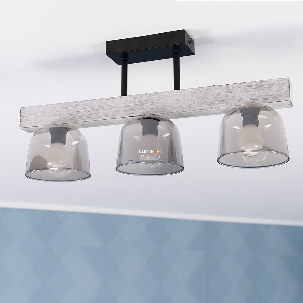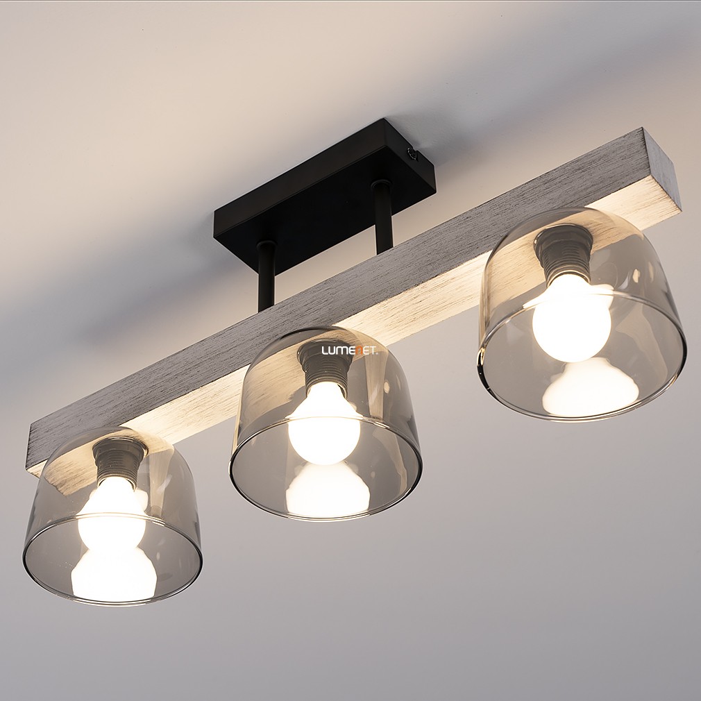 Ez a mennyezeti lámpa füstszínű üveg búrákkal és vintage stílussal varázsolja el otthonodat, miközben a fém, fa és üveg anyagok kombinációja eleganciát és melegséget sugároz.