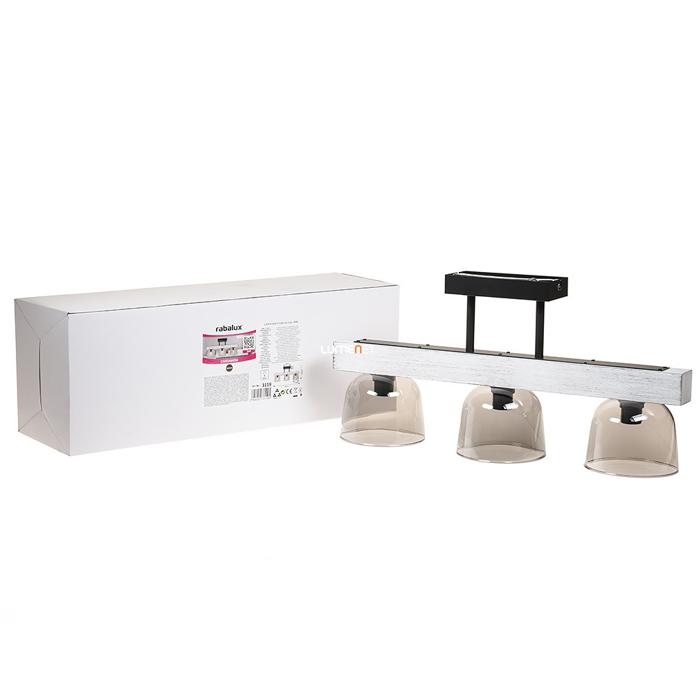 A Cardamom Rábalux 3119 mennyezeti lámpa három darab E14-es foglalattal rendelkezik, melyek cserélhető fényforrással szerelhetők fel. A lámpatest fő anyagai a fém, fa és üveg, ezek kombinációja vintage stílusú megjelenést kölcsönöz a terméknek. A búrák füstszínű üvegből készültek, amelyek elegáns kontrasztot alkotnak az ezüst és fa színű elemekkel. A lámpa méretei: hossza 500 mm, szélessége 120 mm, magassága 240 mm, tömege 1,76 kg. A termék védettségi szintje IP20, így beltéri használatra alkalmas. A lámpatest nem tartalmaz fényforrást, szabályozható funkcióval nem rendelkezik. A logisztikai kód: 3119. A csomagolás mérete 54x17x19 cm. A gyártó a Rábalux.