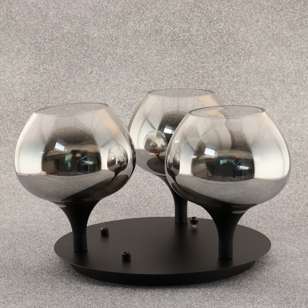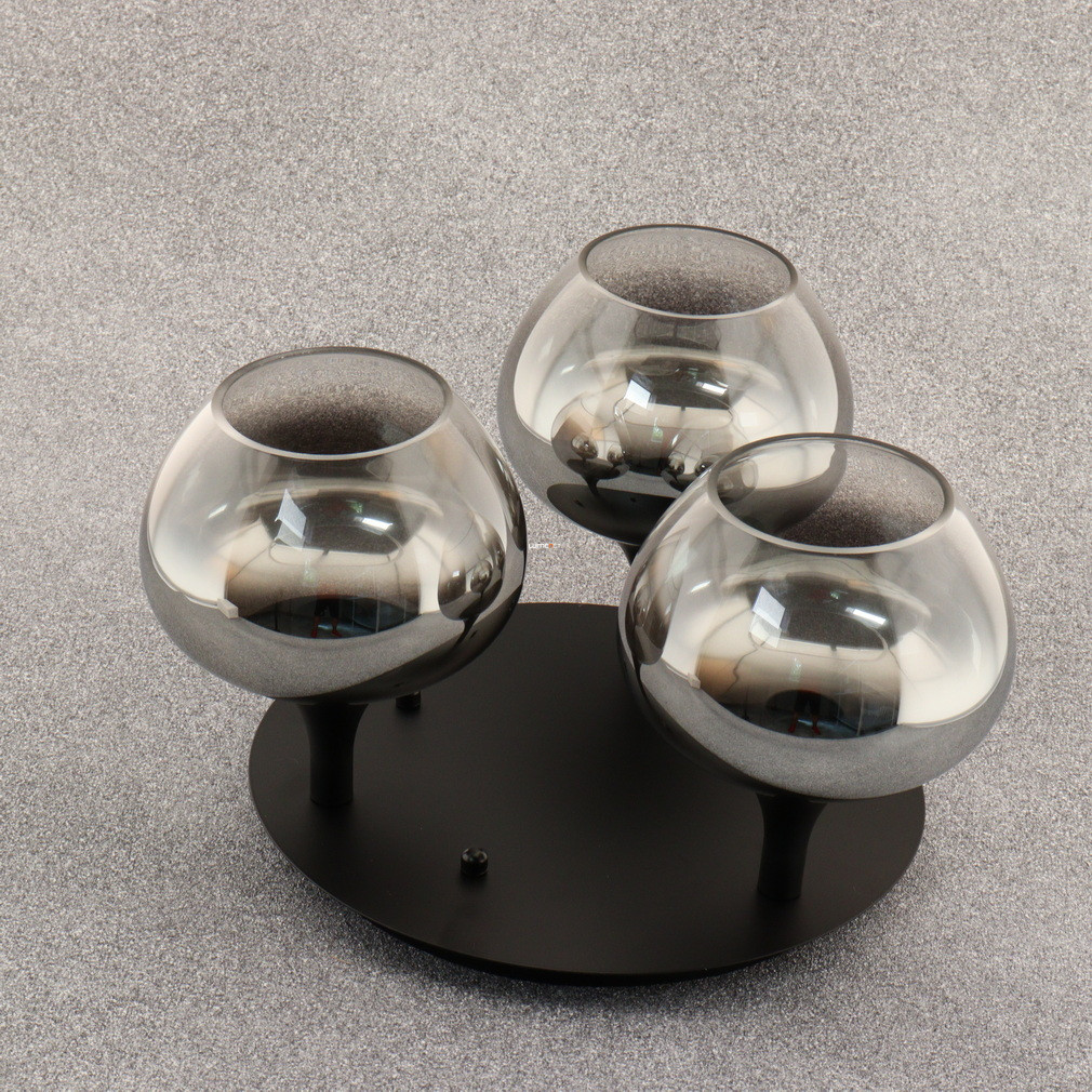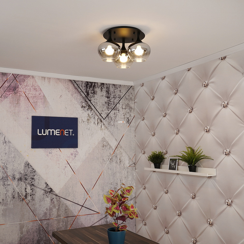 A füstszínű üveggömb búrákkal ellátott mennyezeti lámpa elegáns megjelenést kölcsönöz bármelyik helyiségnek, miközben három E27 foglalatával változatos fényforrásokkal kombinálható.