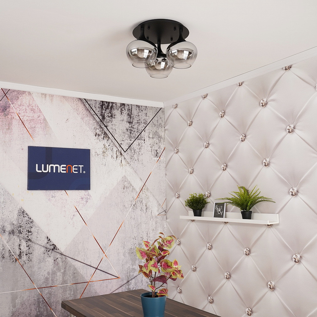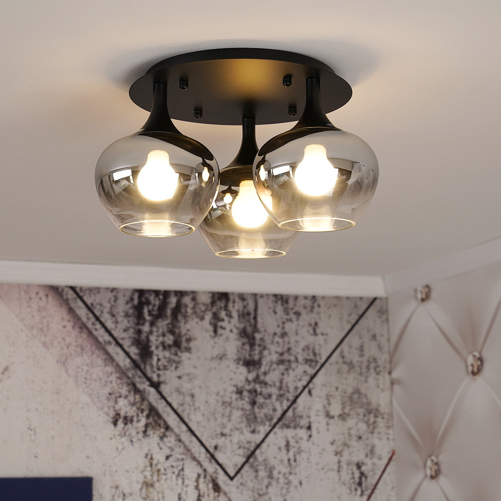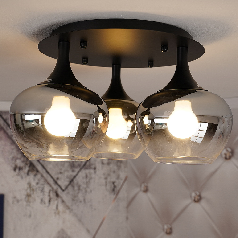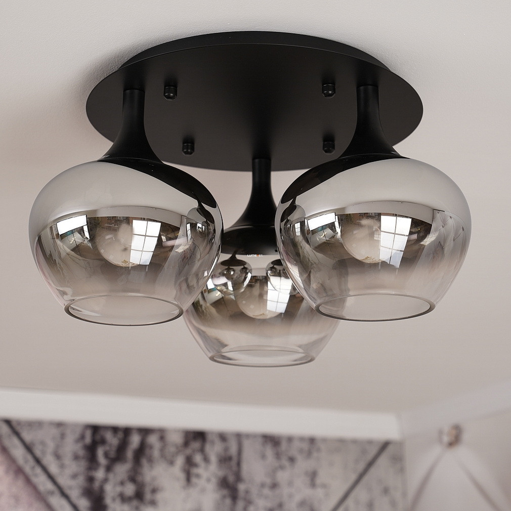 A füstszínű üveggömb búrákkal ellátott mennyezeti lámpa elegáns megjelenést kölcsönöz bármelyik helyiségnek, miközben három E27 foglalatával változatos fényforrásokkal kombinálható.