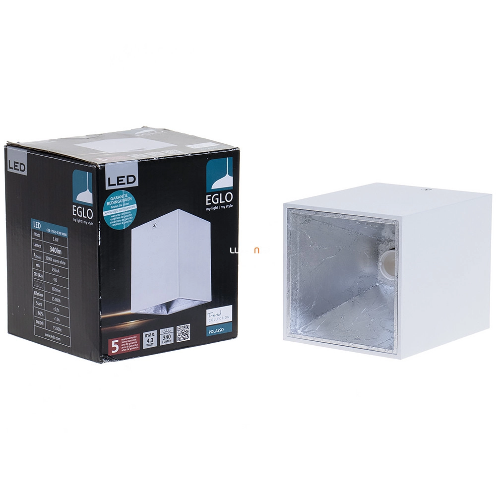 A Polasso Eglo 94499 mennyezeti LED kocka lámpa modern kialakításával és kompakt méretével ideális választás lakásvilágítási megoldásokhoz. A lámpatest 10x10 cm-es alapterülettel és 12 cm magassággal rendelkezik, anyaga alumínium és műanyag, felülete fehér és ezüst színkombinációval készül. Beépített 3,3 W teljesítményű LED modullal működik, amely 340 lumen fényáramot biztosít melegfehér, 3000 K színhőmérsékletű fény kibocsátásával. A lámpa mennyezetre szerelhető kivitelben elérhető, IP20-as védettségi besorolással rendelkezik, így beltéri használatra alkalmas. A termék tömege 0,65 kg, csomagolási mérete 12x12x14 cm. A Polasso Eglo 94499 energiatakarékos működést kínál, a LED modul tartozékként megtalálható a lámpában. A modern stílusú világítótestet az EGLO gyártja.