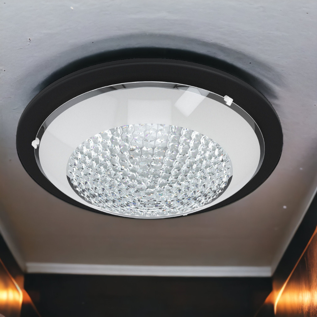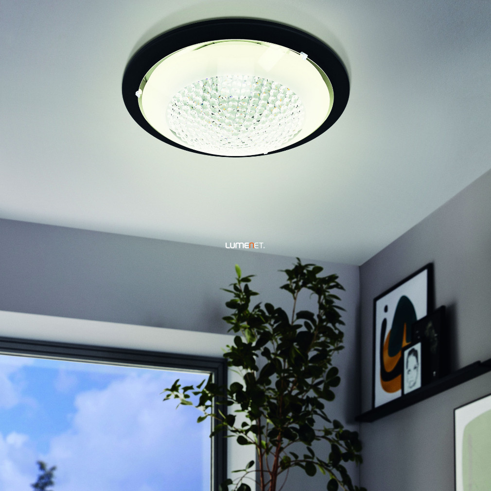 Az Acolla Eglo 99357 mennyezeti LED lámpa 16 W teljesítményű, melegfehér fényt biztosító világítótest, amely 1500 lumen fényáramot ad le 3000 K színhőmérsékleten. A lámpatest klasszikus stílusú, fekete-fehér színkombinációval és áttetsző üveg kristály elemekkel rendelkezik. Az integrált LED modul nem szabályozható, a fényforrás a lámpatest részét képezi. A termék acél és üveg anyagokból készült, IP20 védettséggel látják el, így beltéri használatra alkalmas. Átmérője 370 mm, magassága 90 mm, tömege 1,99 kg. A csomagolás méretei: 37 x 37 x 10 cm. A lámpa megbízható fényforrást kínál otthoni vagy irodai környezetben, egyszerű mennyezeti telepítéssel.