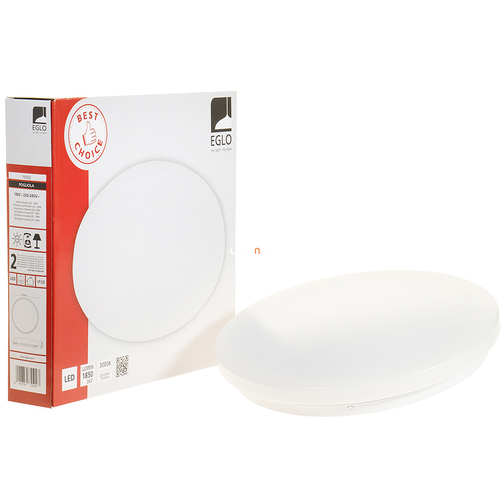 A Pogliola Eglo 75502 mennyezeti LED lámpa 31 cm átmérővel és 5,5 cm magassággal rendelkezik. A lámpatest fehér színű, acél és műanyag anyagokból készült, így modern megjelenést és tartósságot biztosít. A beépített LED modul 18 W teljesítményt nyújt, amely 1800 lumen fényáramot bocsát ki melegfehér, 3000 Kelvin színhőmérséklettel. A lámpa nem szabályozható, a fényforrást tartalmazza, átlagos élettartama eléri a 25 000 órát. IP20 védettségi besorolása beltéri használatra teszi alkalmassá. A termék tömege 0,52 kg. A csomagolás méretei: 32 cm hosszúság, 31 cm magasság és 6 cm szélesség. A lámpa gyártója az EGLO.