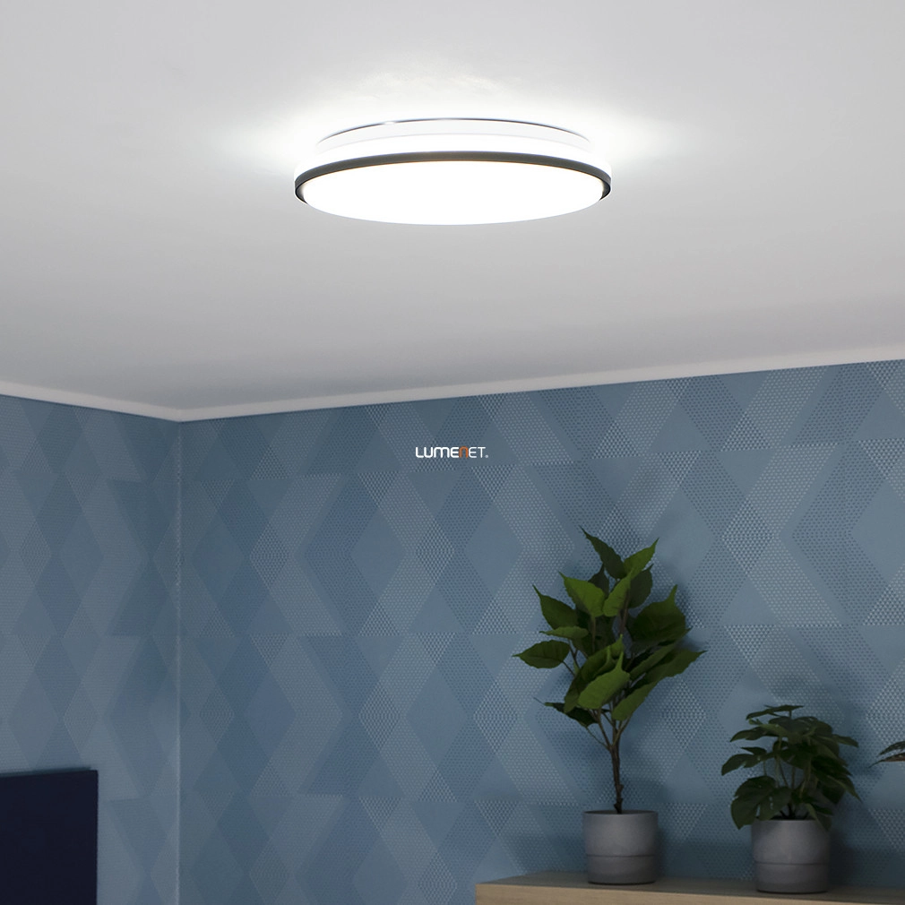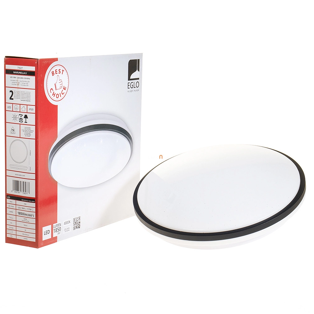 A Marunella-S Eglo 75627 mennyezeti LED lámpa egy 34 cm átmérőjű, modern világítótest, amely 18 W teljesítményű, beépített LED modullal működik. A lámpatest fényárama 1900 lumen, amely hidegfehér, 4000 K színhőmérsékletű fényt biztosít. A csillám hatású kivitel elegáns megjelenést kölcsönöz a lámpának, míg a fehér és fekete színű acél, alumínium és műanyag anyaghasználat tartósságot és stílust garantál. A lámpa IP20 védettségi szinttel rendelkezik, így beltéri használatra alkalmas. Nem szabályozható, a fényforrása beépített LED modul, amelyet a csomag tartalmaz. A termék tömege 0,52 kg, magassága 65 mm, csomagolási méretei pedig 35x35x7 cm. Gyártója az EGLO.