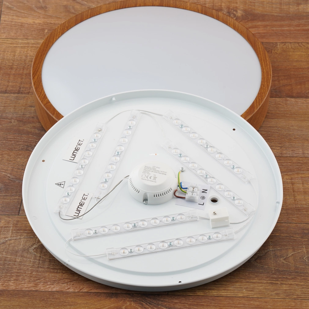 A Musurita Eglo 98602 mennyezeti LED lámpa 36 W teljesítménnyel és 3600 lumen fényárammal biztosítja a melegfehér, 3000 K színhőmérsékletű világítást. A modern stílusú lámpatest fa-fehér színkombinációval, 440 mm átmérővel és 75 mm magassággal rendelkezik. A beépített LED modul nem szabályozható, a lámpatest IP20 védettséggel ellátott, így beltéri használatra alkalmas. Anyaga műanyag és acél, amely tartósságot és letisztult megjelenést kölcsönöz. A termék tömege 1,76 kg, csomagolási mérete 49 x 49 x 8 cm. A lámpa a fényforrást tartalmazza, a gyártó az EGLO.
