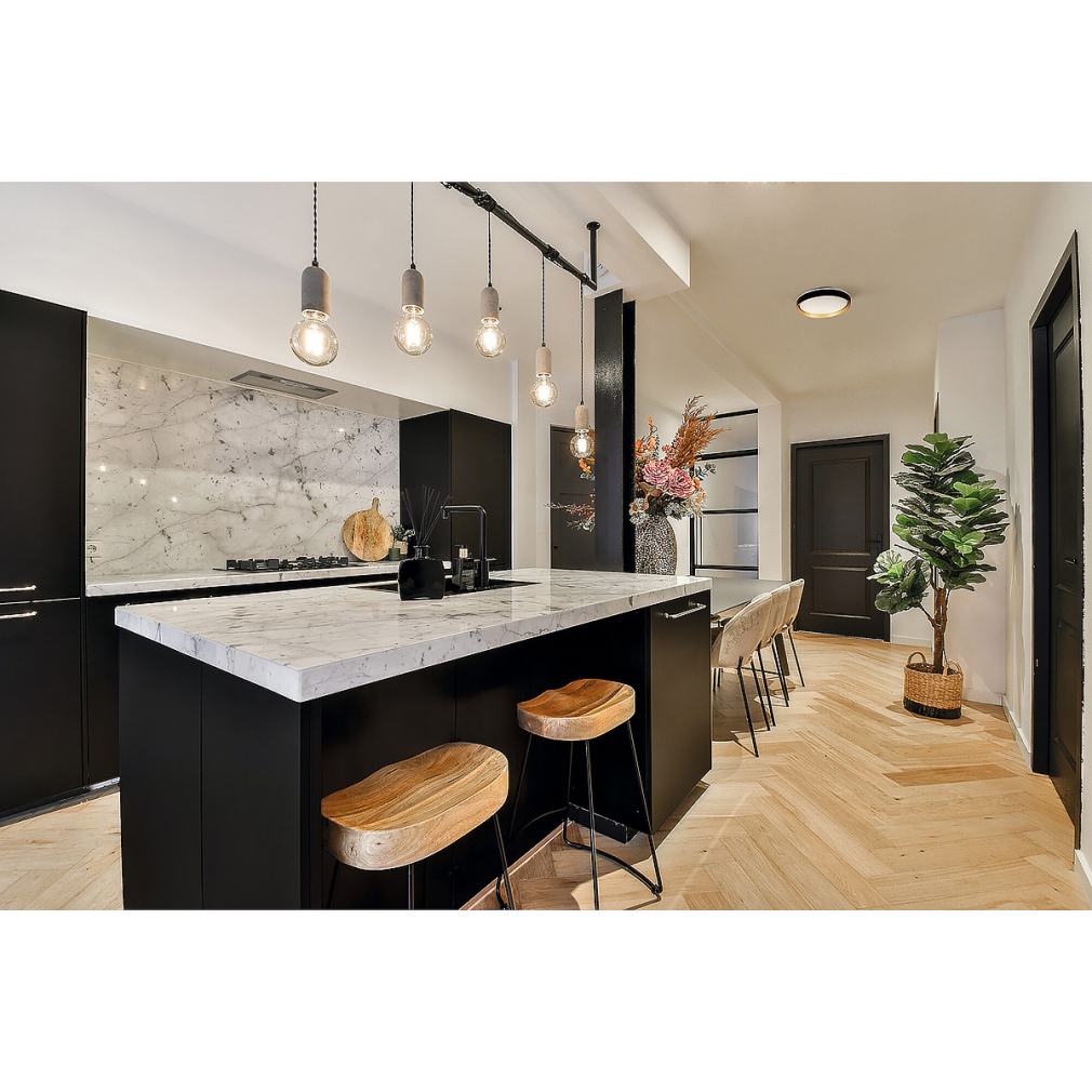 A Soln Kanlux 37324 mennyezeti LED lámpa 38 cm átmérőjű, modern kialakításával falra és mennyezetre egyaránt szerelhető. A lámpatest beépített 17,5 W teljesítményű LED modullal rendelkezik, amely 945 lumen fényáramot biztosít hidegfehér, 4000 K színhőmérsékleten. A 120°-os sugárzási szög és a 80-as színvisszaadási index egyenletes, természetes megvilágítást eredményez. A termék IP20 védettséggel, fém házzal, fekete-arany színben készül. Átlagos élettartama 25 000 óra, névleges feszültsége 220-240 V. A lámpatest tömege 0,784 kg, magassága 75 mm. A csomagolás mérete 42x42x8 cm.