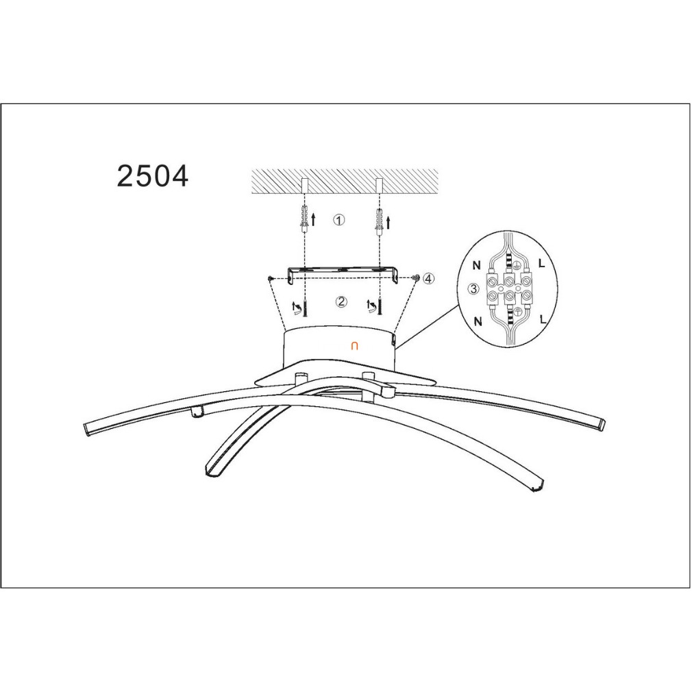 Az Alexis Rábalux 2504 mennyezeti LED lámpa három darab 7 wattos LED modullal működik, teljesítménye 21 watt. A lámpatest fényárama 1500 lumen, színhőmérséklete 4000 Kelvin, amely hidegfehér fényt biztosít. A termék IP20 védettséggel rendelkezik, így beltéri használatra alkalmas. A lámpa modern stílusban készült, króm színű fém és műanyag anyaghasználattal. Átmérője 585 mm, magassága 130 mm, a beépített LED modulnak köszönhetően nem igényel külön fényforrást. Az átlagos élettartam eléri a 30 000 órát, a termék nem szabályozható fényerővel rendelkezik. A csomagolás méretei: 23 cm szélesség, 15 cm hosszúság, 72 cm magasság. Gyártója a Rábalux.