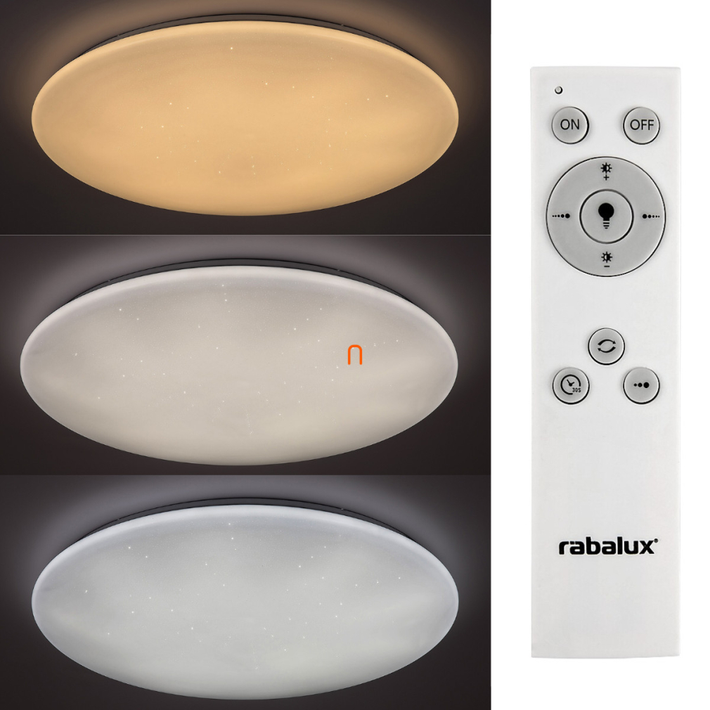 A Danny Rábalux 5445 mennyezeti LED lámpa 40 cm átmérővel, letisztult fehér színben, modern megjelenést biztosít bármely lakótérben. A lámpatest 36 W teljesítményű LED modullal szerelt, amely 3000 lumen fényáramot kínál, így kiváló fényviszonyokat teremt. A színhőmérséklet 3000 és 6500 Kelvin között fokozatmentesen állítható, lehetővé téve a meleg fehér és hideg fehér fény közötti választást. A lámpa távirányítóval szabályozható, amely a csomag része. A termék IP20 védettségi besorolású, így beltéri használatra alkalmas. A lámpatest fém és műanyag anyagokból készült, átlagos élettartama eléri a 30 000 órát. A névleges feszültség 230 V. A lámpa nem tartalmaz fényforrást, LED modul foglalattal rendelkezik. A termék tömege 1,46 kg, magassága 75 mm, átmérője 400 mm. A csomagolás méretei: 46,5 cm hosszúság, 46 cm magasság és 8 cm szélesség.