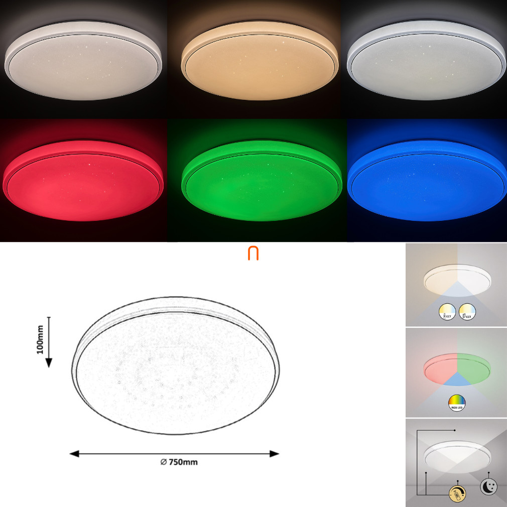 A mennyezeti LED lámpa 60 W teljesítményével és 4800 lumen fényáramával tökéletes választás, ha erőteljes és egyenletes megvilágítást keresel. A lámpa fém és műanyag anyagokból készült, ami biztosítja a tartósságot és a modern megjelenést. A lámpa különlegessége a változtatható fehér és színes (RGBW) fény, amely lehetővé teszi, hogy a hangulatodnak megfelelően állítsd be a világítást. A színhőmérséklet 3000-6000 Kelvin között változtatható, így a hideg és meleg fehér fény között is választhatsz. A lámpa csillám hatású kivitele különleges eleganciát kölcsönöz a térnek. A beépített memória funkcióval a lámpa megjegyzi az utolsó beállítást, így mindig a kedvenc fényed fogad, amikor bekapcsolod. Az időzítő funkcióval pedig előre beállíthatod, mikor kapcsoljon ki vagy be, ami különösen hasznos lehet esti pihenéskor. Az éjjeli fény funkció pedig gyengéd, pihentető fényt biztosít az éjszakai órákra. A lámpa szabályozható kapcsolóval és távirányítóval, ami a csomag része, így könnyedén irányíthatod a fényerőt és a színeket. Az átmérője 750 mm, magassága pedig 100 mm, ami ideálissá teszi nagyobb helyiségek megvilágítására is. A lámpa LED modullal működik, így nem kell külön fényforrást vásárolnod, és hosszú élettartamot biztosít.