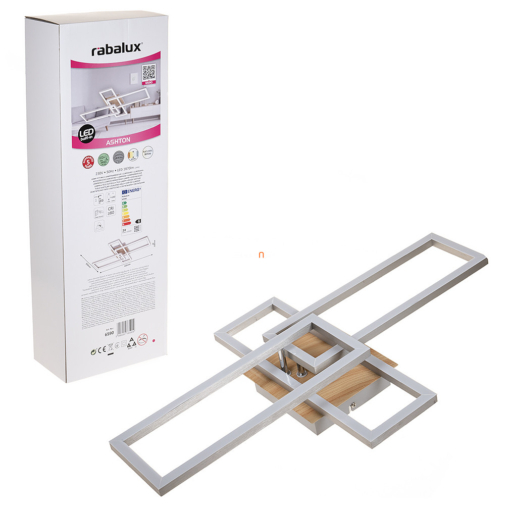 A Mennyezeti LED lámpa fehér színben, Ashton Rábalux 6590 modell, modern kialakítású világítótest, amelyet a Rábalux gyárt. A lámpatest 24 W teljesítményű beépített LED modullal rendelkezik, amely 1870 lumen fényáramot biztosít hidegfehér, 4000 K színhőmérsékletű fénykibocsátással. A termék IP20 védettségű, így beltéri használatra alkalmas. A lámpatest fő anyagai a fém és a műanyag, színe fehér és króm kombinációja. Méretei 645 mm hosszúság, 350 mm szélesség és 100 mm magasság. A fényforrás nem cserélhető, mivel a LED modul fixen beépített. A lámpa nem szabályozható, így a fényerő állítása nem lehetséges. A termék csomagolási méretei: 54 cm hosszú, 18 cm széles és 11 cm magas, össztömege 1,1 kg.