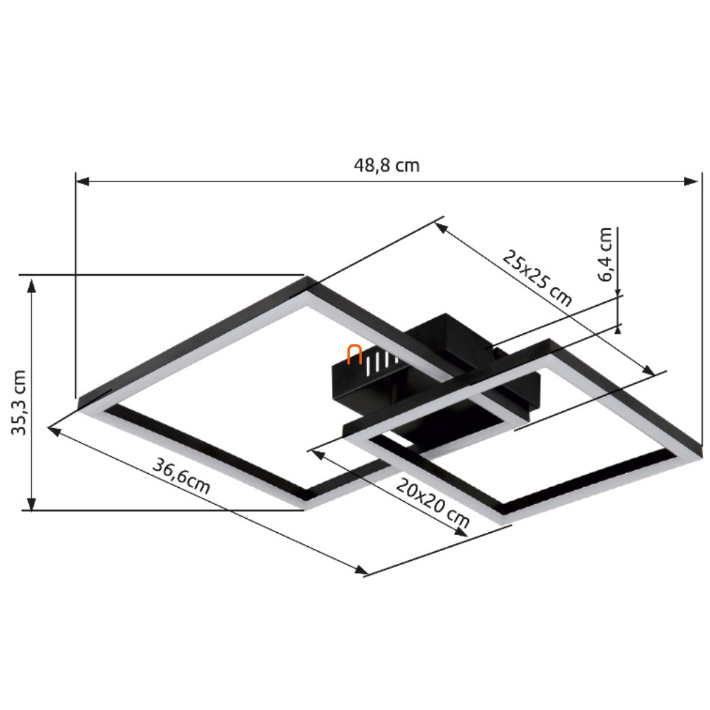 A Tyler Globo 672842 mennyezeti LED lámpa modern, matt fekete színű kivitelben készül, amely opál burával egészül ki. A lámpatest teljesítménye 24 W, beépített LED modullal, amely 800 lumen fényáramot biztosít. A fényforrás melegfehér színű, 3000 K színhőmérséklettel, így kellemes, otthonos megvilágítást eredményez. A lámpa 488 mm hosszú, 353 mm széles és 64 mm magas, anyaga tartós műanyag. A termék IP20 védettséggel rendelkezik, így beltéri használatra alkalmas. A névleges feszültsége 230 V. A csomagolás méretei: 8 cm széles, 28 cm hosszú, 31 cm magas, a lámpa tömege 1,1 kg. A gyártó a Globo.