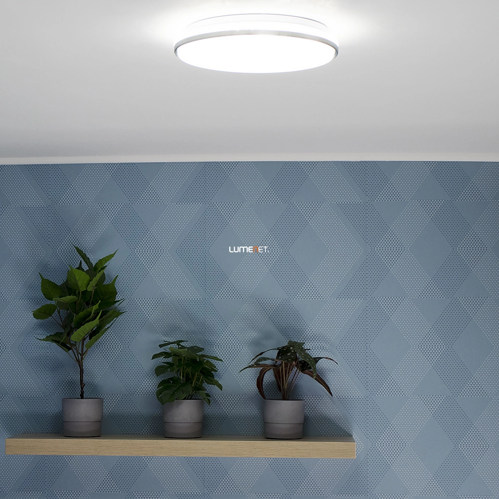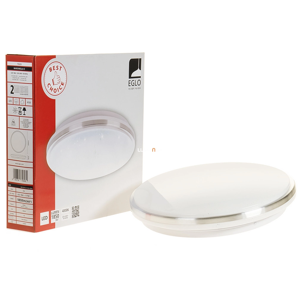 A Marunella-S Eglo 75626 mennyezeti LED lámpa modern, 34 cm átmérőjű kialakításával és nikkel színű, csillám hatású kivitelével illeszkedik a korszerű lakásvilágítási igényekhez. A beépített 18 W-os LED modul 1900 lumen fényáramot biztosít, 4000 Kelvin színhőmérsékleten hidegfehér fényt adva, amely ideális általános világítási célokra. A lámpatest acél, alumínium és műanyag anyagok kombinációjával készült, amely tartósságot és esztétikus megjelenést garantál. A termék IP20 védettségi besorolással rendelkezik, így beltéri használatra alkalmas. A lámpa magassága 65 mm, átmérője 340 mm, nem szabályozható, a fényforrást tartalmazza. A csomagolás méretei: 35x35x7 cm, tömege 0,52 kg. Gyártója az EGLO.