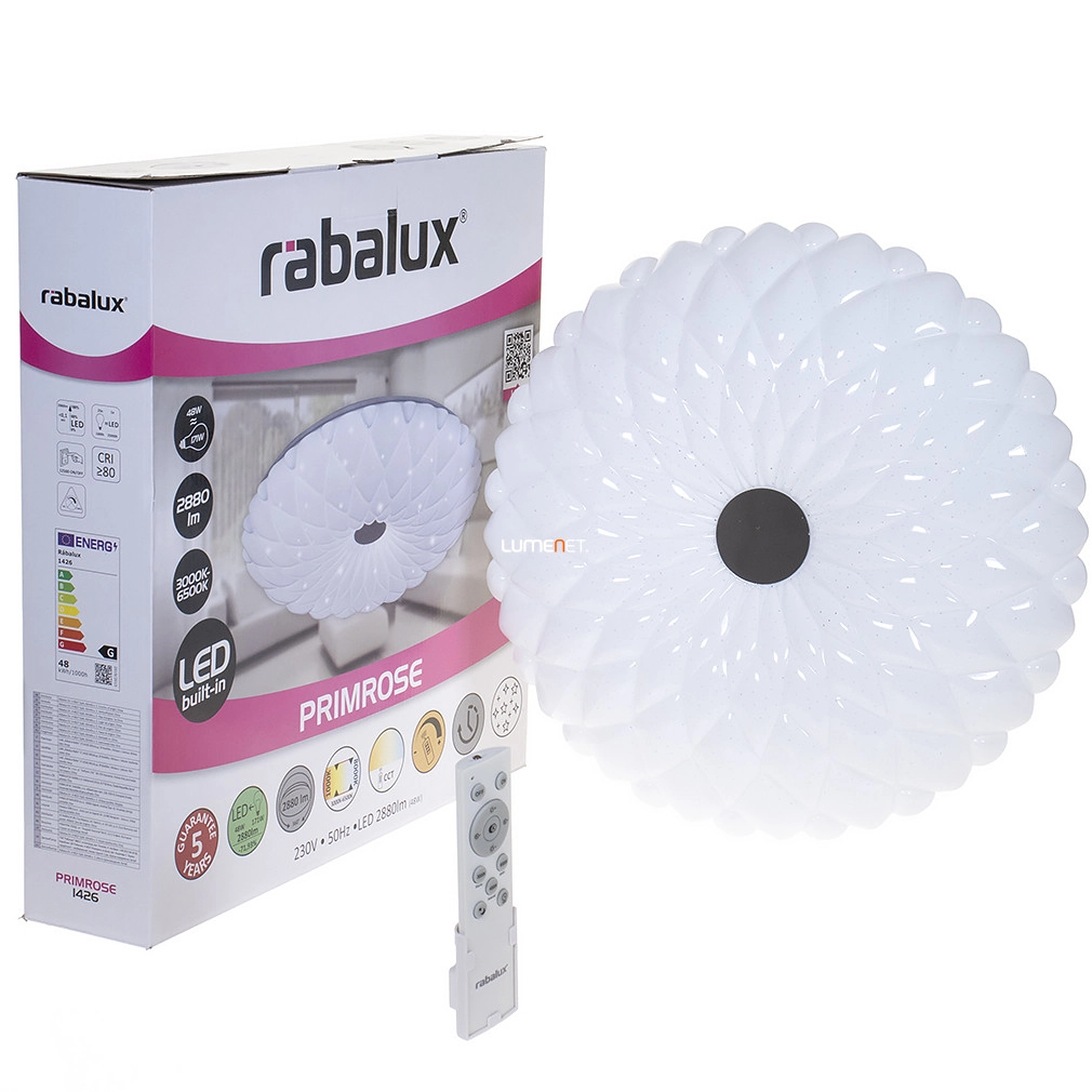 A Primrose Rábalux 1426 mennyezeti LED lámpa modern stílusú, virág formájú búrával rendelkezik, amely elegánsan illeszkedik a lakás bármely helyiségébe. A lámpatest 48 W teljesítményű, beépített LED modullal működik, amely 2880 lumen fényáramot biztosít. A fény színhőmérséklete 3000 és 6500 Kelvin között változtatható, így meleg és hideg fehér fény is beállítható az igények szerint, mindezt a mellékelt távirányítóval szabályozva. Az opál és ezüst színű, fém és műanyag anyaghasználatú lámpa 38 cm átmérőjű, IP20-as védettségi besorolással rendelkezik, amely beltéri használatra alkalmas. Az eszköz átlagos élettartama 25 000 óra, a fényforrást tartalmazza, így azonnal üzembe helyezhető.