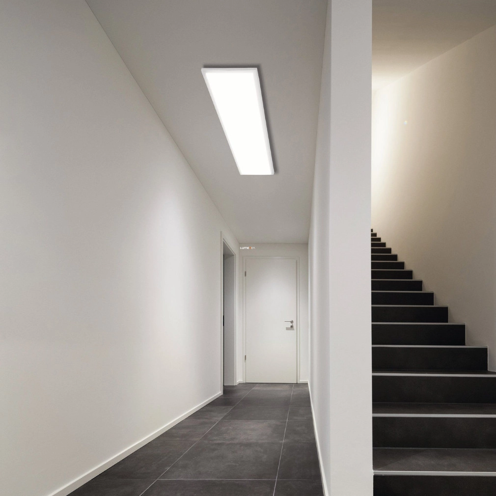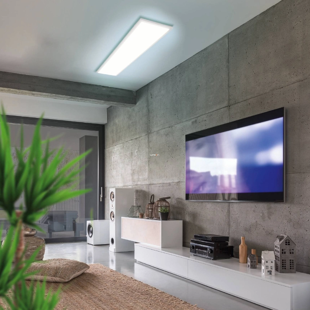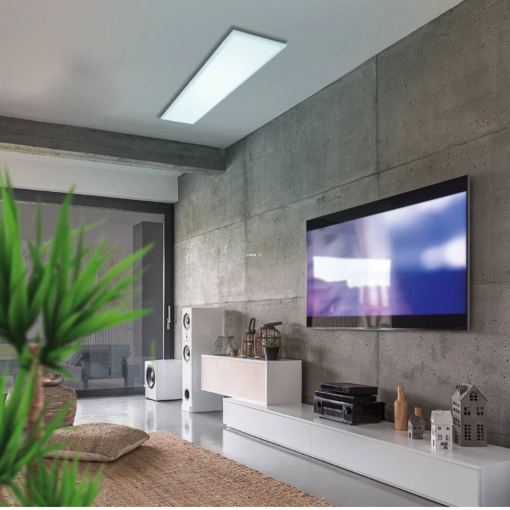 A Salobrena-B-RGBW Eglo 98767 mennyezeti LED panel egy 120x30 cm méretű, modern világítótest, amely fejlett RGBW technológiájának köszönhetően változtatható fehér és színes fények kibocsátására alkalmas. A lámpatest 32,5 wattos beépített LED modullal rendelkezik, amely 4200 lumen fényáramot biztosít, így hatékony és egyenletes megvilágítást nyújt nagyobb helyiségekben is. A színhőmérséklet 2700 és 6500 Kelvin között állítható, valamint teljes RGB spektrum is elérhető, így a világítás hangulata könnyedén igazítható a felhasználói igényekhez. A termékhez tartozó távirányítóval a fényerő és a színek kényelmesen szabályozhatók, valamint memóriafunkcióval is rendelkezik, amely megőrzi a legutóbb beállított fényparamétereket. A lámpatest IP20 védettségi szinttel rendelkezik, így beltéri használatra alkalmas. A fehér színű, alumíniumból, acélból és műanyagból készült test modern és letisztult megjelenést biztosít. A panel beépített LED fényforrást tartalmaz, így az azonnal üzembe helyezhető. A termék tömege 3,173 kg, a csomagolás méretei pedig 121x31x6 cm.