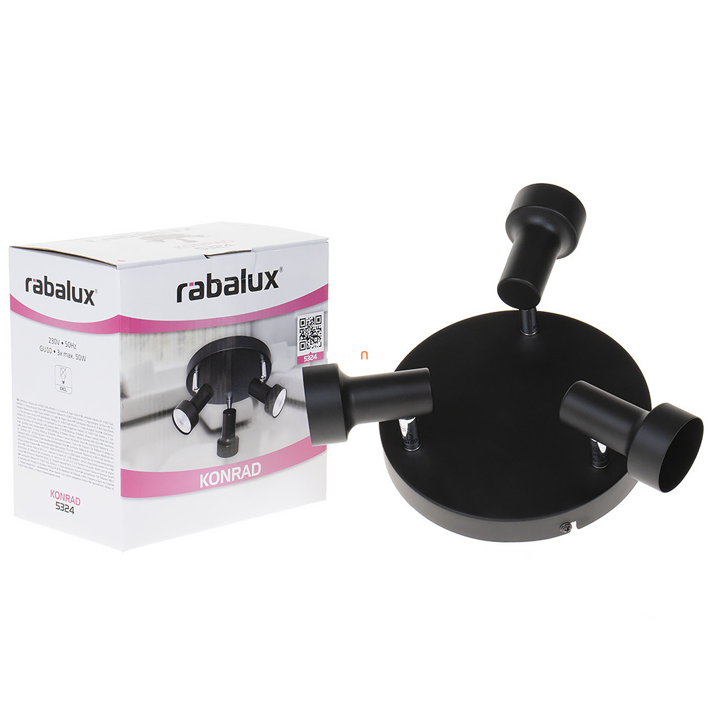 A Konrad Rábalux 5324 mennyezeti spot lámpa modern megjelenésével és három GU10 foglalatával ideális választás lakásvilágításhoz. A lámpatest fekete és ezüst színű fém anyagból készült, amely tartósságot és letisztult esztétikát biztosít. A lámpa átmérője 205 mm, magassága 100 mm, tömege pedig 0,64 kg. A termék IP20 védettséggel rendelkezik, így beltéri használatra alkalmas. A lámpatest nem tartalmaz fényforrást, a fényáram, fényszín, teljesítmény és színhőmérséklet a behelyezett cserélhető fényforrástól függ. A termék nem szabályozható, a csomagolás méretei 20x20x12 cm. A gyártó a Rábalux.