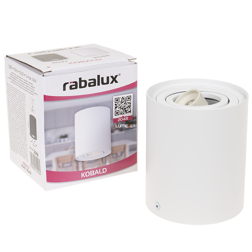 A Kobald Rábalux 2048 mennyezeti spot lámpa egy funkcionális világítási megoldás, amelyet mennyezetre szerelhető kivitelben terveztek. A lámpatest fehér színű, anyaga alumínium és fém, így tartós és modern megjelenésű. Egy darab GU10 foglalattal rendelkezik, a fényforrás cserélhető, így a fényáram, fényszín, teljesítmény és színhőmérséklet a választott fényforrástól függ. A lámpa nem szabályozható, védettségi besorolása IP20, amely beltéri használatra teszi alkalmassá. Átmérője 90 mm, magassága 105 mm, tömege 0,33 kg. A csomagolás méretei: 10x10x11 cm. A termék nem tartalmaz fényforrást.