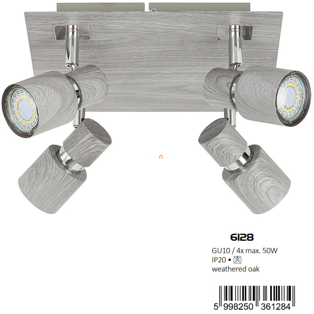 A Merkur Rábalux 6128 mennyezeti spot lámpa négy GU10 foglalattal rendelkezik, amelyek cserélhető fényforrásokkal kompatibilisek. A lámpatest modern stílusban készült, szürke színű fém anyagból, amely időtálló megjelenést biztosít. A termék teljes mérete 250 mm hosszú, 250 mm széles és 110 mm magas, így ideális választás kisebb és közepes helyiségek megvilágítására. A lámpa nem tartalmaz fényforrást, a fényáram, fényszín, teljesítmény és színhőmérséklet a behelyezett izzótól függően változhat. A termék IP20 védettséggel rendelkezik, így beltéri használatra alkalmas. A csomagolás méretei: 25 cm szélesség, 12 cm hosszúság és 26 cm magasság, a termék tömege 1,45 kg. A lámpa nem szabályozható, a gyártó Rábalux.