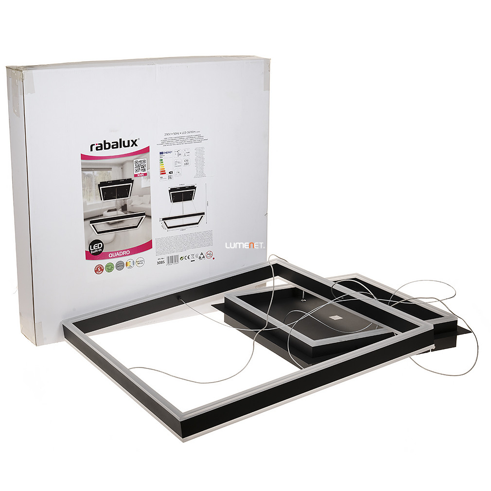A Quadro Rábalux 3085 mennyezetivel kombinált függesztett LED lámpa letisztult, minimál stílusban készült, mely a modern enteriőrök követelményeihez igazodik. A lámpatest 60 W teljesítményű integrált LED modullal van felszerelve, amely 1670 lumen fényáramot biztosít hidegfehér (4000 K) színhőmérséklettel. A termék nem szabályozható, IP20 védettségi szinttel rendelkezik, így elsősorban beltéri használatra alkalmas. A lámpa fő anyaga fém és műanyag, választható fekete vagy fehér színben. Méretei 600 mm hosszúság, 400 mm szélesség és 1200 mm magasság, tömege 5,5 kg, átlagos élettartama eléri a 20 000 órát. A csomagolás mérete 63x63x10 cm, a gyártó pedig a Rábalux.